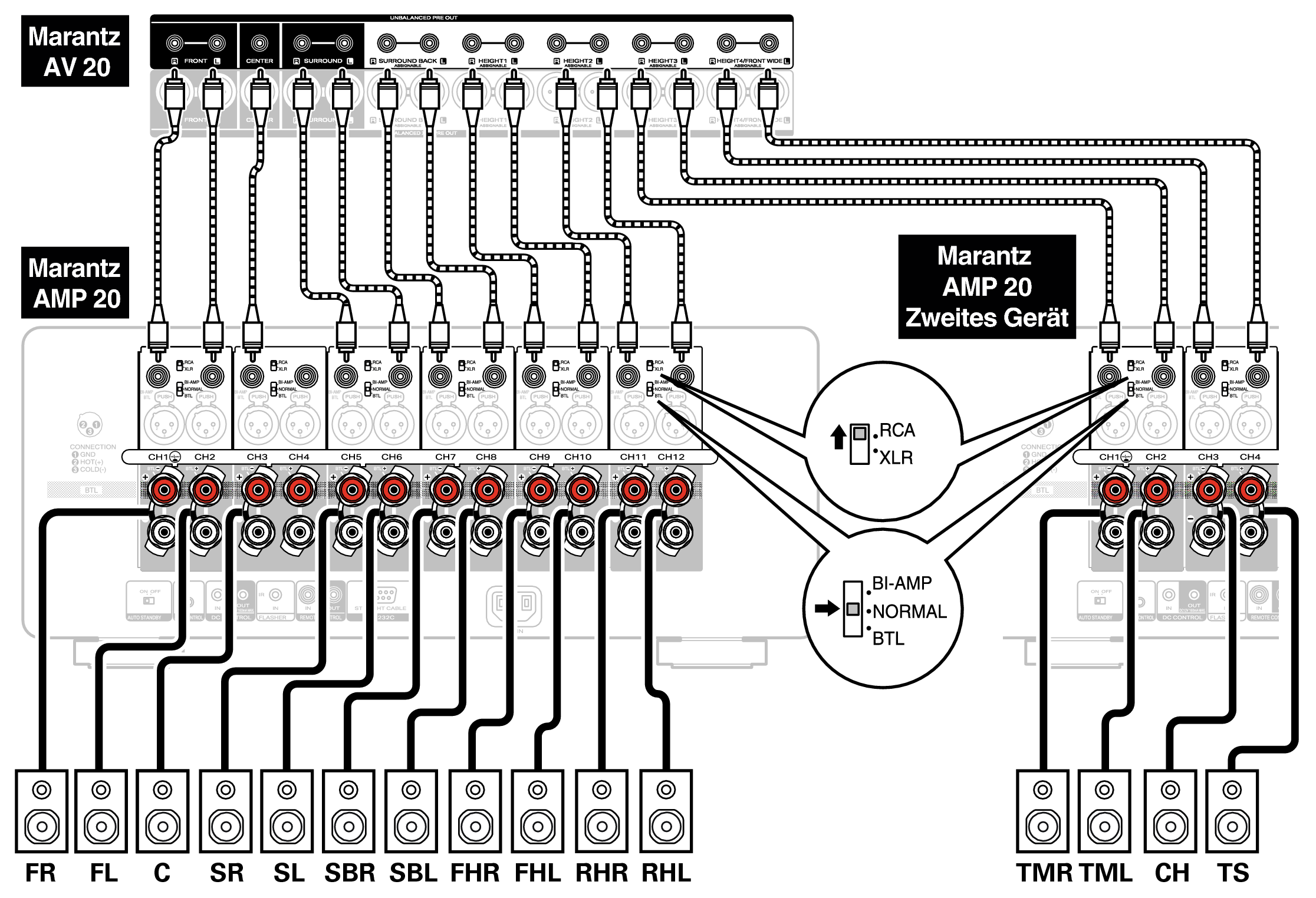 Wenn Sie die BALANCED XLR-Anschlüsse verwenden, stellen Sie den RCA/XLR INPUT-Auswahlknopf dieses Geräts auf “XLR”. Stellen Sie den NORMAL/BI-AMP/BTL-Auswahlknopf auf “NORMAL”.