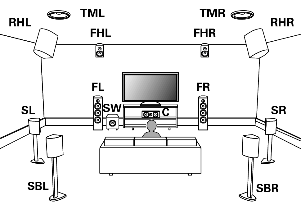 Example layout when using surround back, Front Wide and two set of height speakers