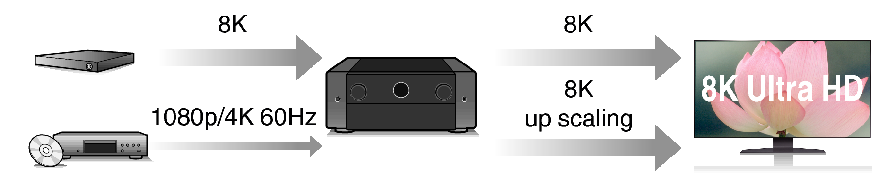 This unit is equipped with a 8K video upscaling function that allows 1080p/4K video to be output via HDMI at 8K (7680 × 4320 pixels) resolution. This function enables the device to be connected to a TV using a single HDMI cable, and produces high definition images for any video source.