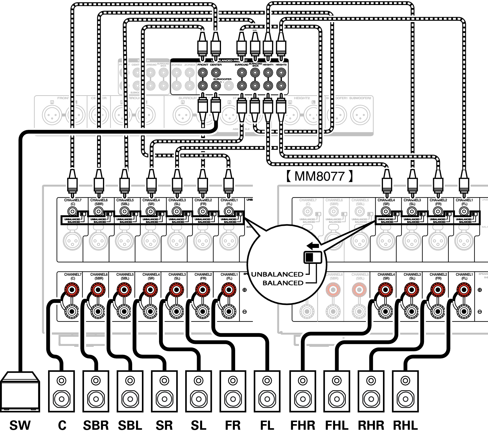 Lors de l’utilisation des connecteurs UNBALANCED RCA pour la connexion, réglez le commutateur de changement d’entrée sur “UNBALANCED” sur MM8077.
