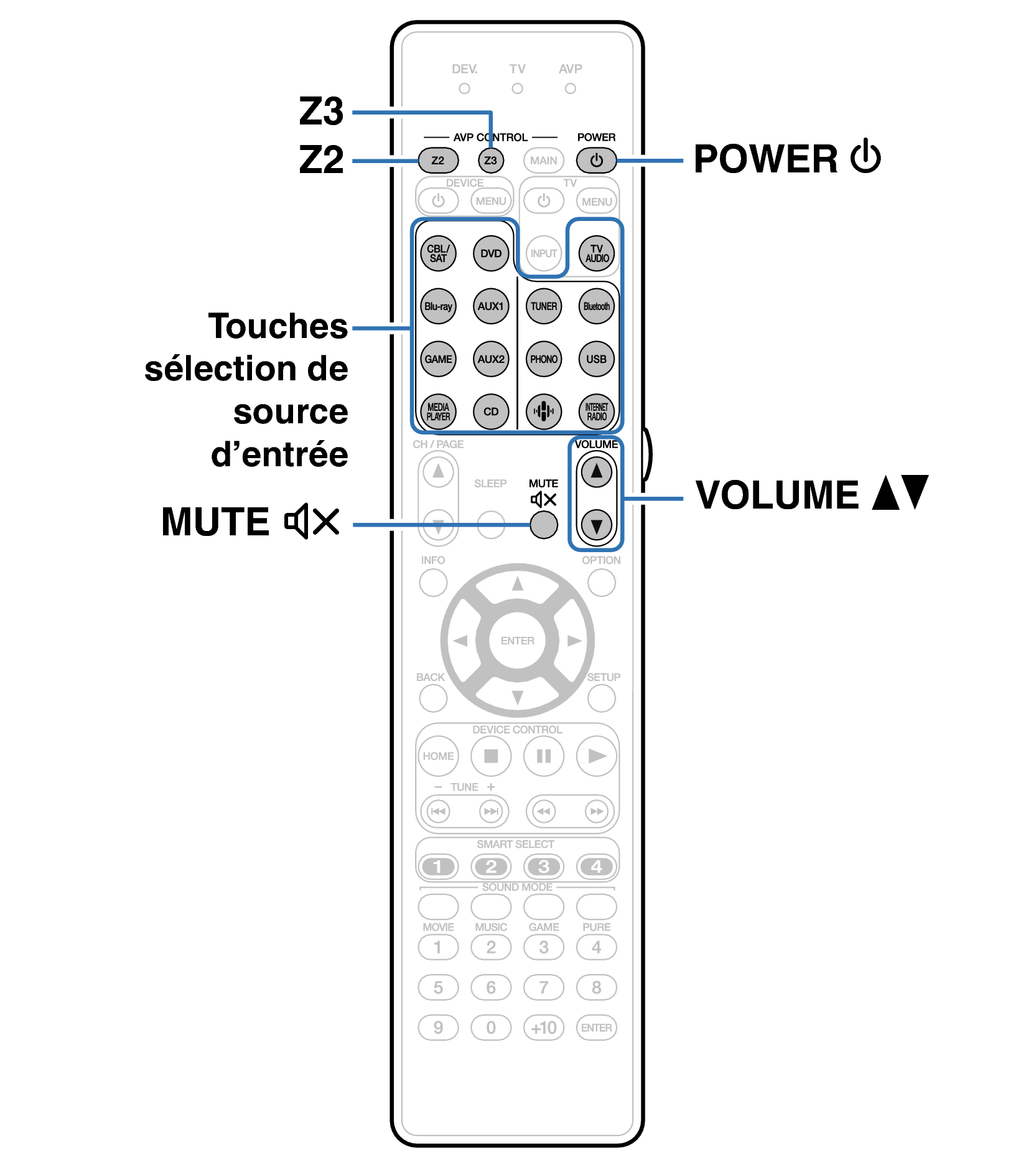 Vous pouvez également sélectionner ZONE2 ou ZONE3 comme source d’entrée en appuyant sur ZONE SELECT et en tournant la molette INPUT SELECTOR.