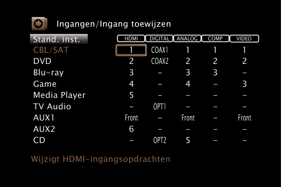 Wijzig de toewijzing van de HDMI-ingang, digitale audio-ingang, analoge audio-ingang, component video-ingang en video-ingang wanneer een ingangsbron wordt aangesloten die verschilt van deze die naar de audio-/video-ingangen van dit toestel wordt ingevoerd.