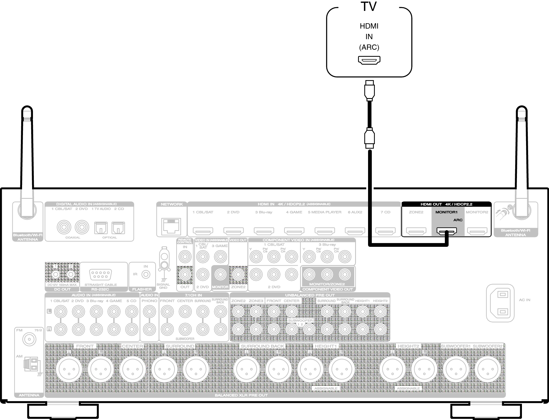 Wanneer u de ARC-functie gebruikt, sluit u het aan op de HDMI MONITOR 1 aansluiting.