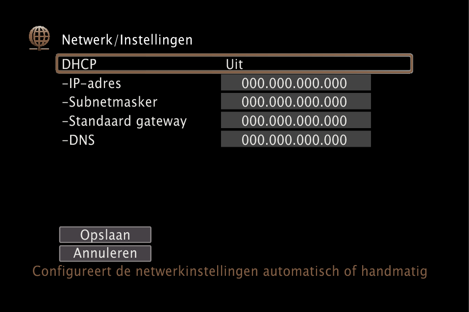 Stel de informatie voor IP-adres, Subnetmasker, Standaard gateway en de DNS-server alleen in wanneer u een vast IP-adres toewijst of wanneer u een verbinding maakt met een netwerk zonder DHCP-functie.