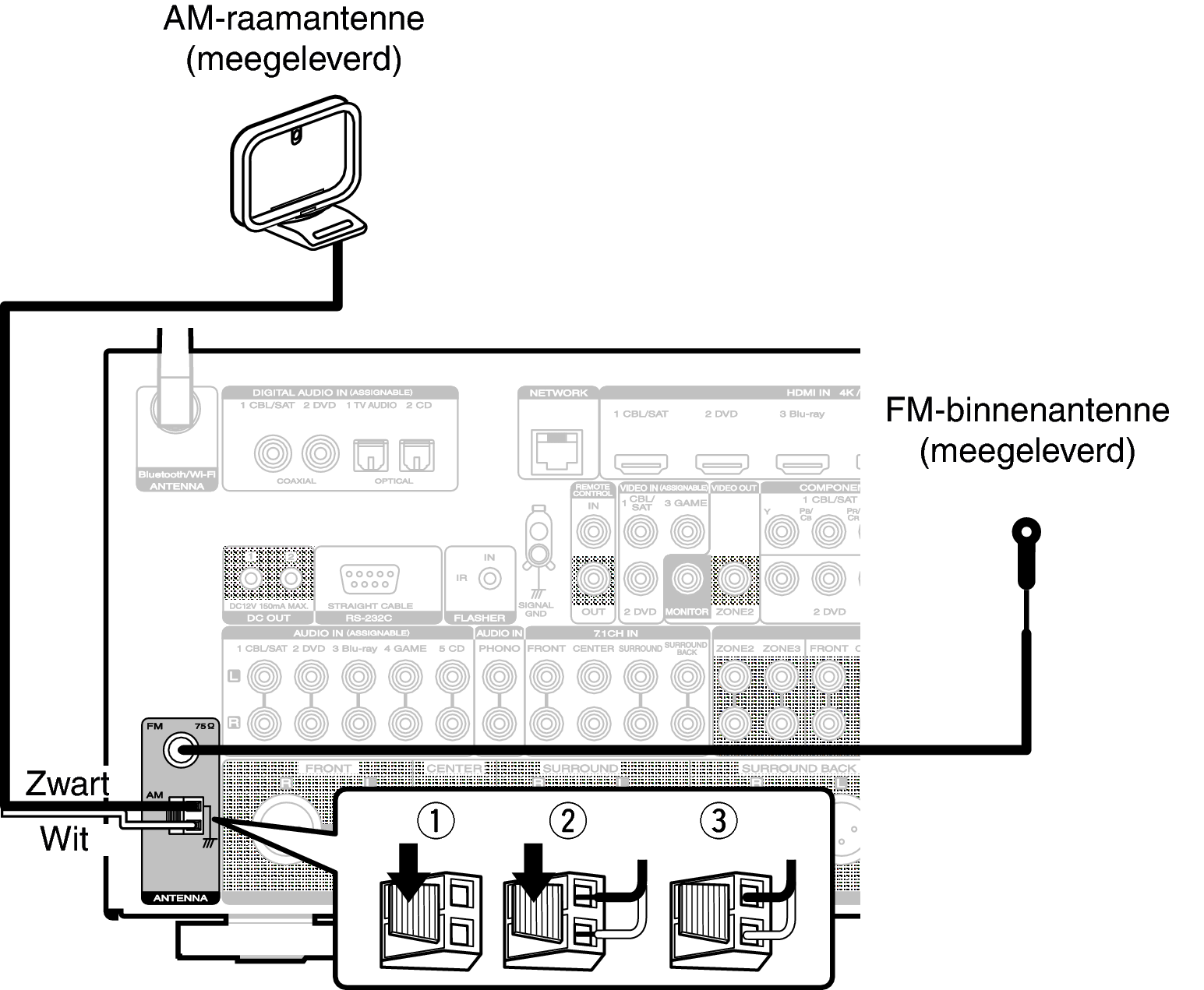 Sluit de antenne aan, stem af op een uitzending en verplaats dan de antenne naar de locatie waar er het minste ruis is. Gebruik dan tape, enz. om de antenne te bevestigen op deze locatie. (Luisteren naar FM/AM-uitzendingenkoppeling)