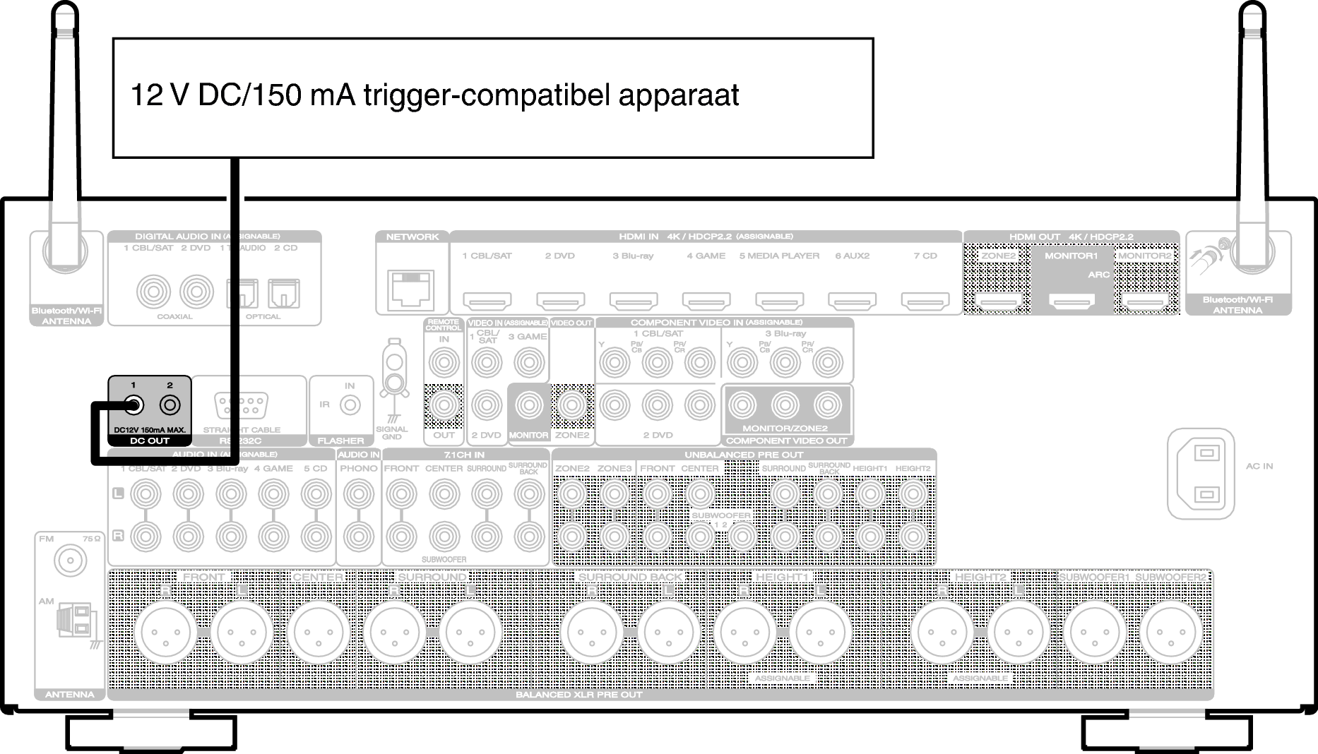 De DC OUT uitgang stuurt een elektrisch signaal uit van maximaal 12 V DC /150 mA.