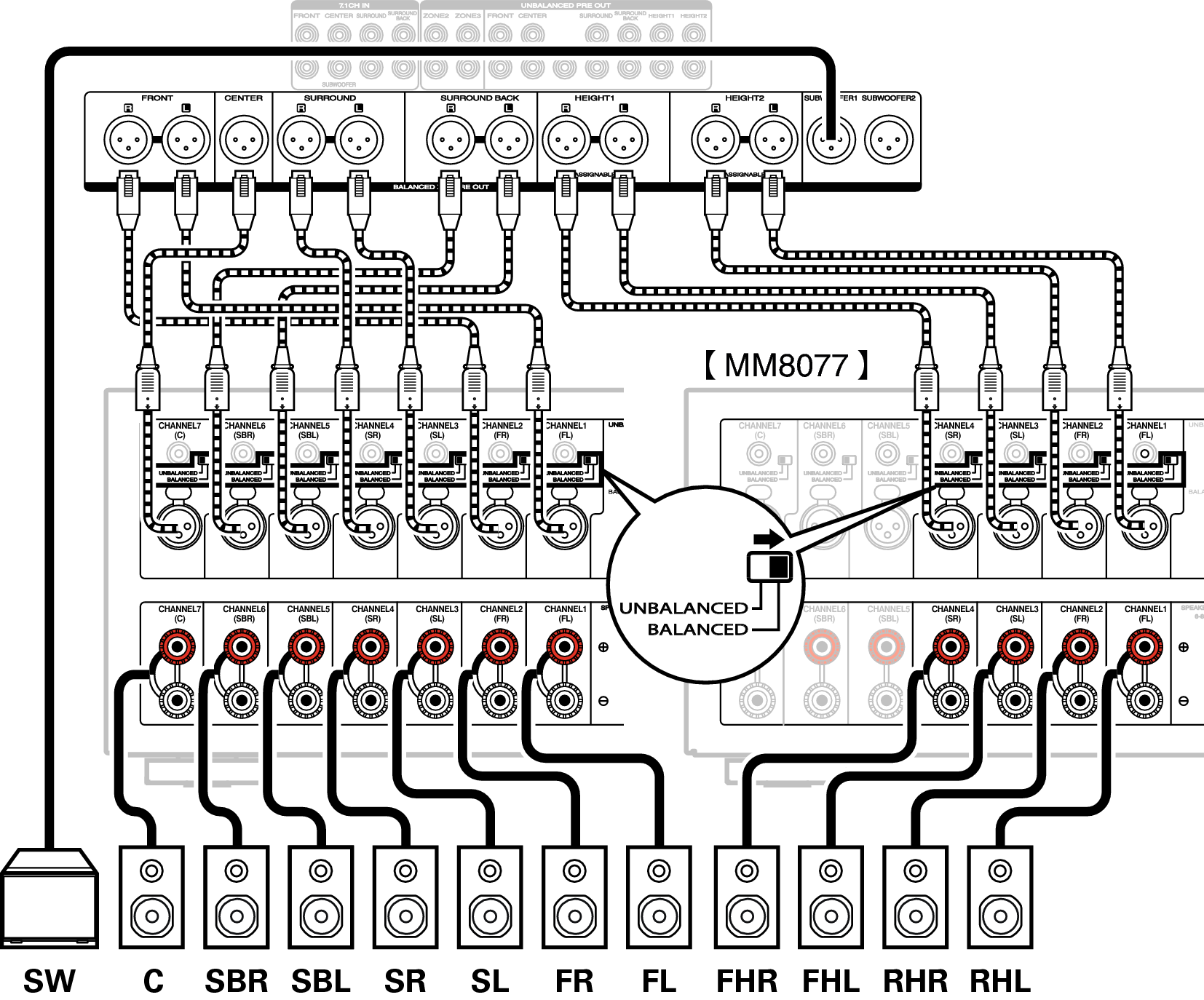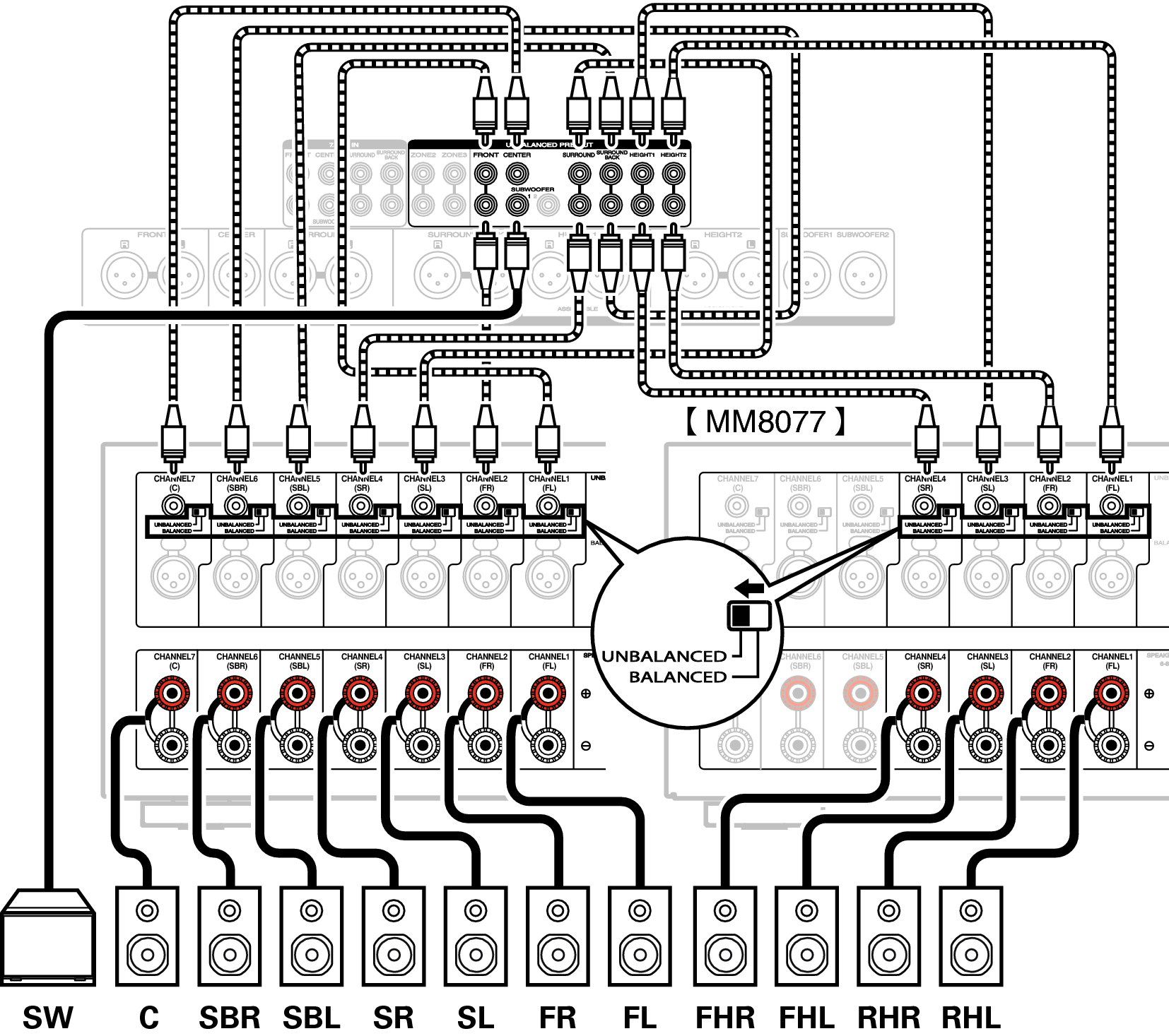 При использовании разъемов UNBALANCED RCA для подключения установите переключатель изменений входа в положение “UNBALANCED” на MM8077.