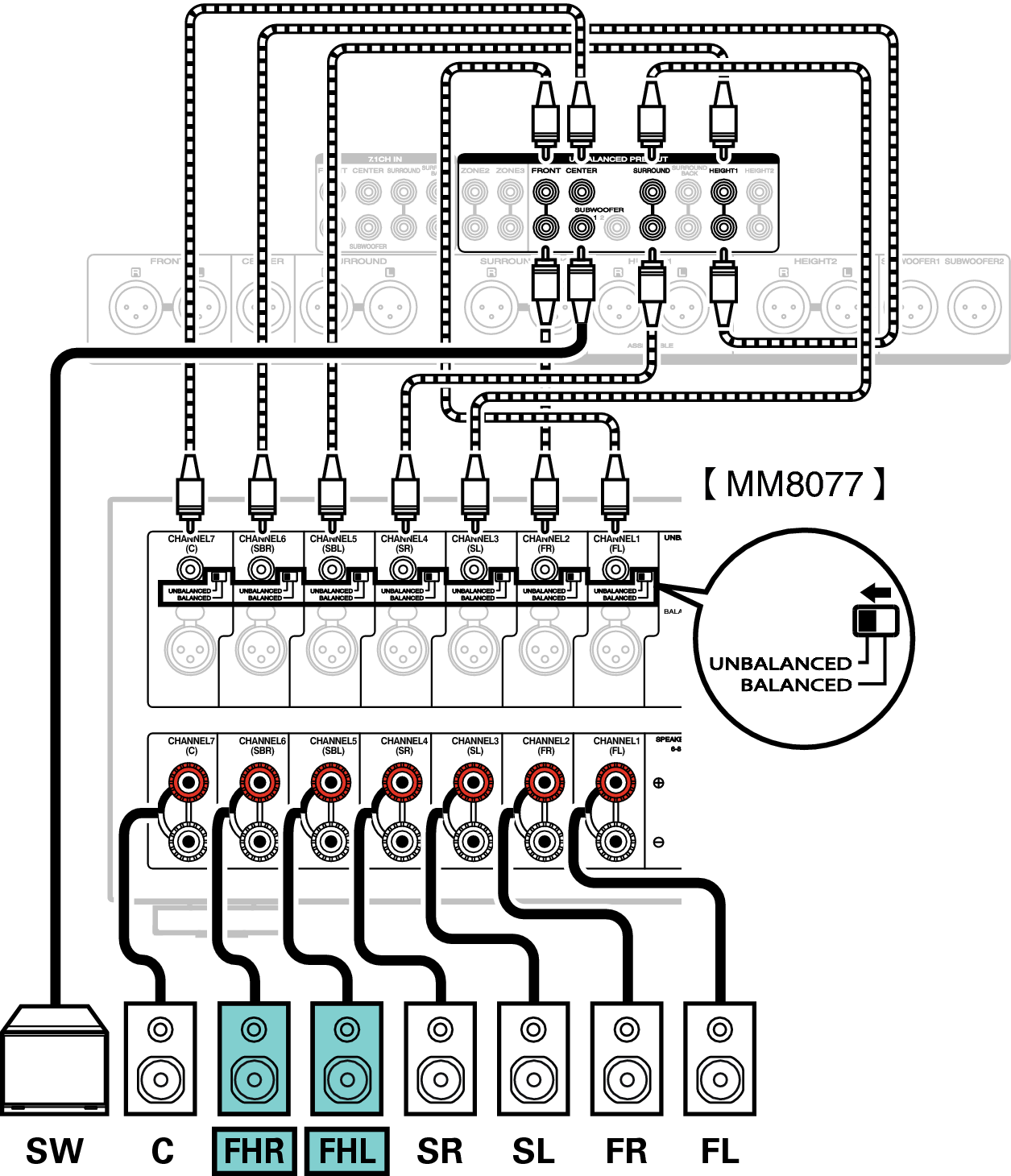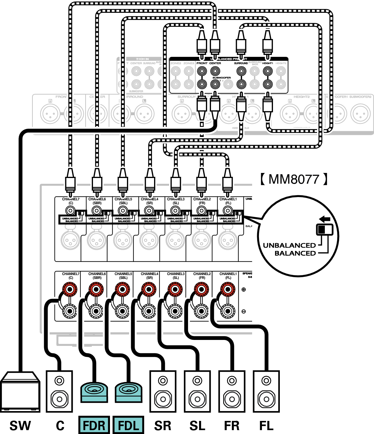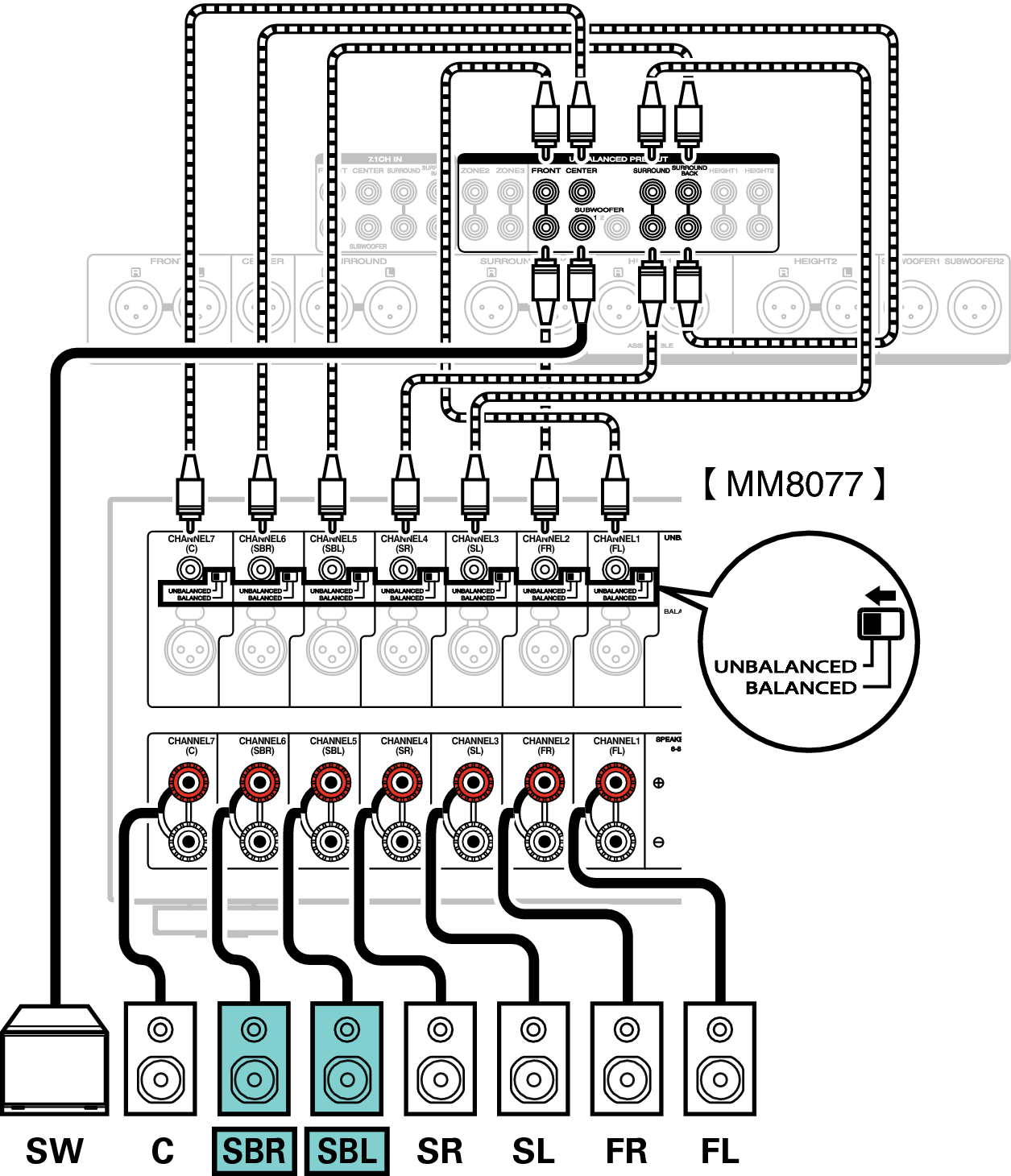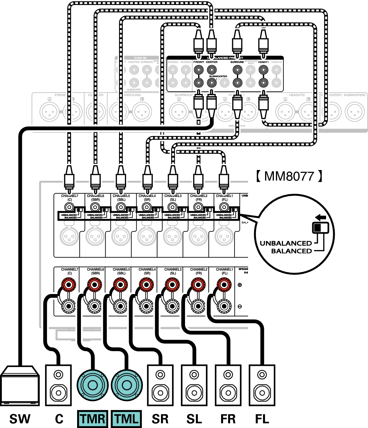В данном примере описано, как выполнить подключение с помощью разъемов UNBALANCED RCA.