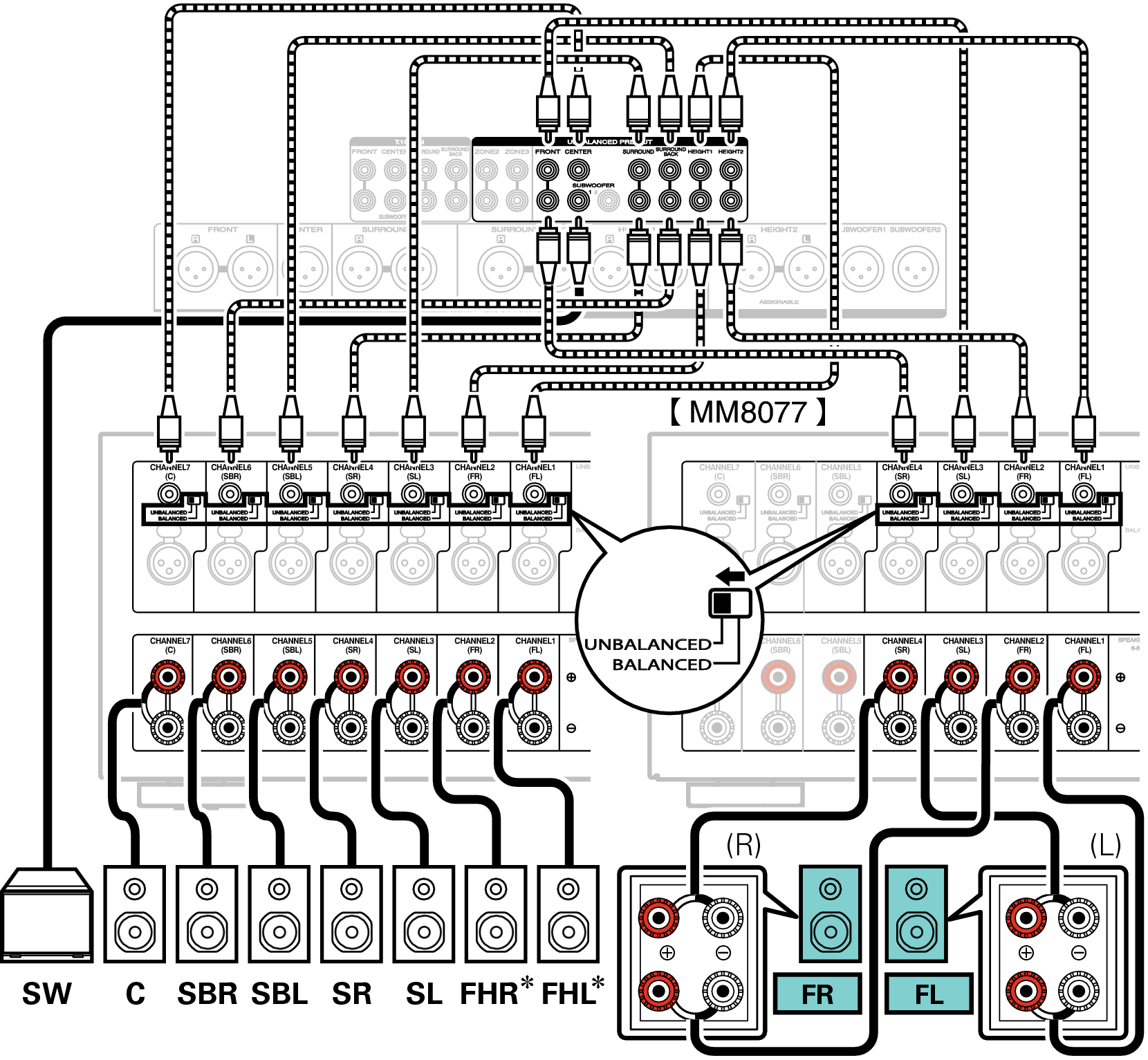 Подключение 9.1-канальных динамиков: соединение двух усилителей для фронтальных