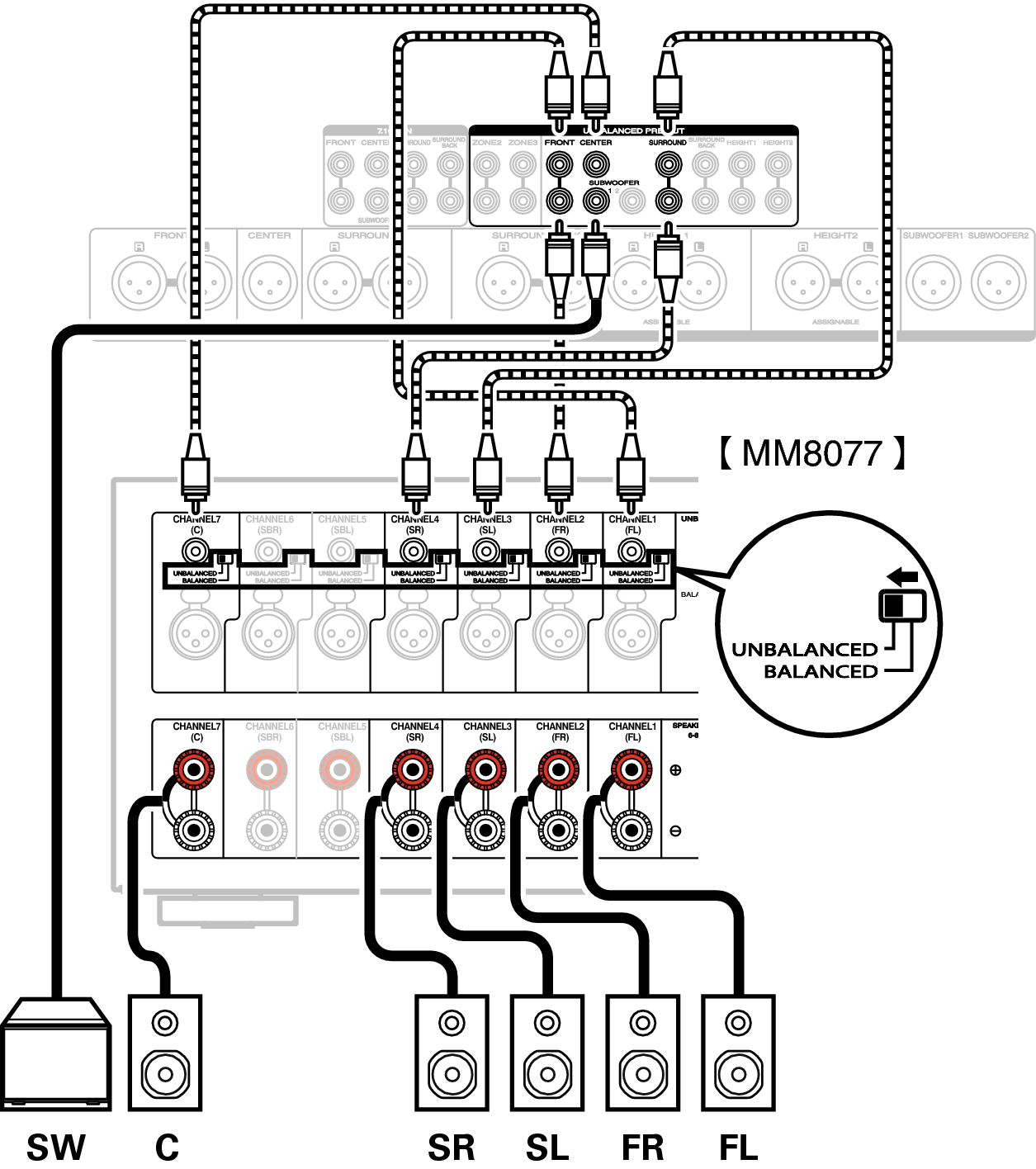 В данном примере описано, как выполнить подключение с помощью разъемов UNBALANCED RCA.