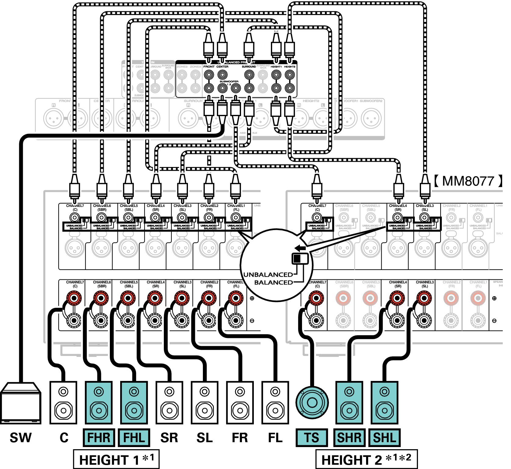 Выходные каналы с разъемов HEIGHT1, HEIGHT2 RCA и HEIGHT1, HEIGHT2 XLR можно заменить на следующие шаблоны в зависимости от используемых систем динамиков.