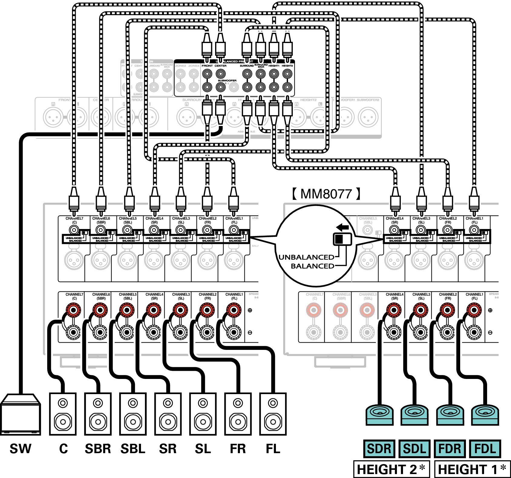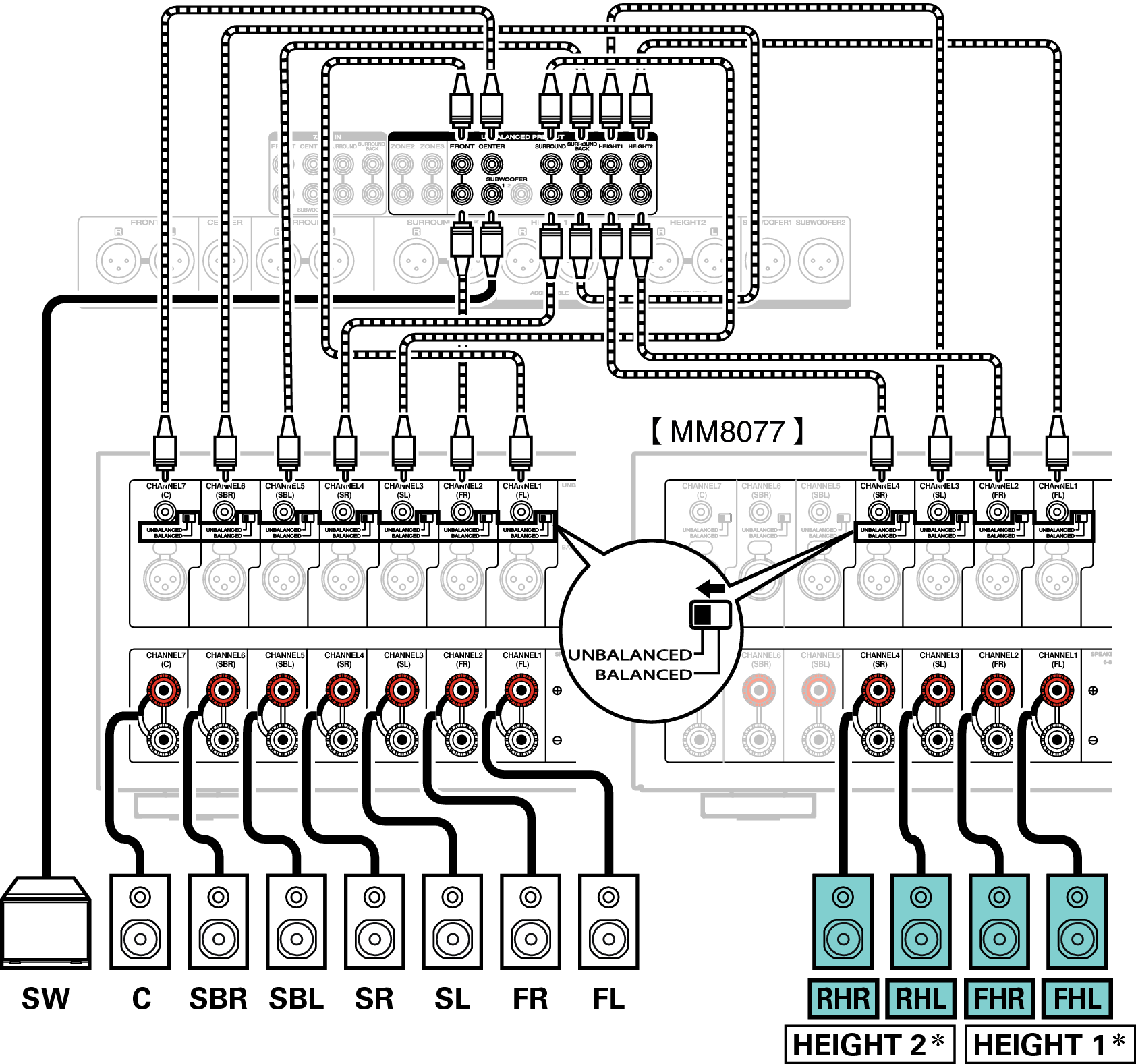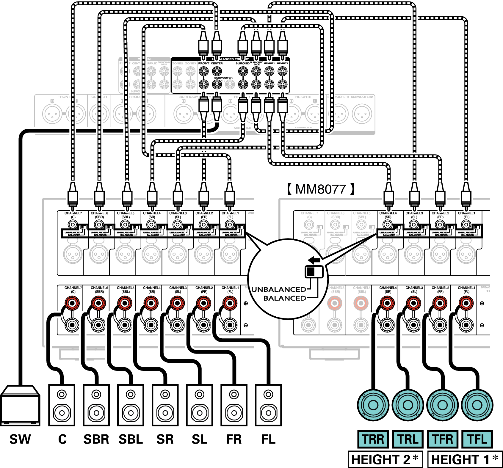 Можно подключить до 11.2 каналов с помощью разъемов UNBALANCED RCA или BALANCED XLR.