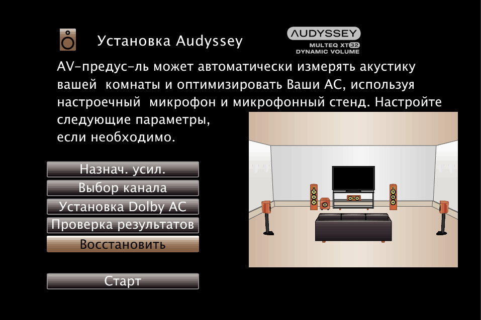 Если параметр “Восстановить” установлен в положение “Восст.”, можно вернуться к результатам измерений Установка Audyssey® (значения рассчитываются перед началом операции модулем MultEQ® XT32), даже если Вы изменили каждый параметр вручную.