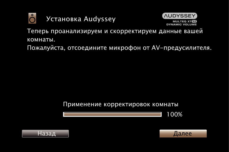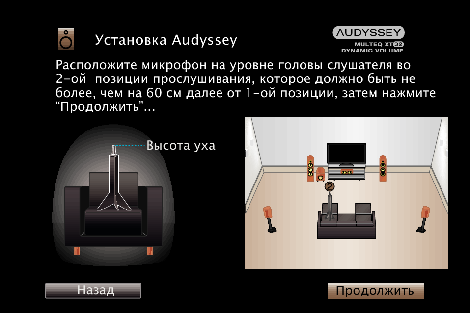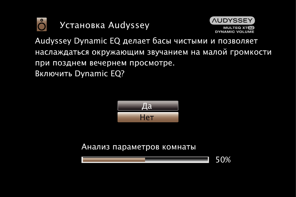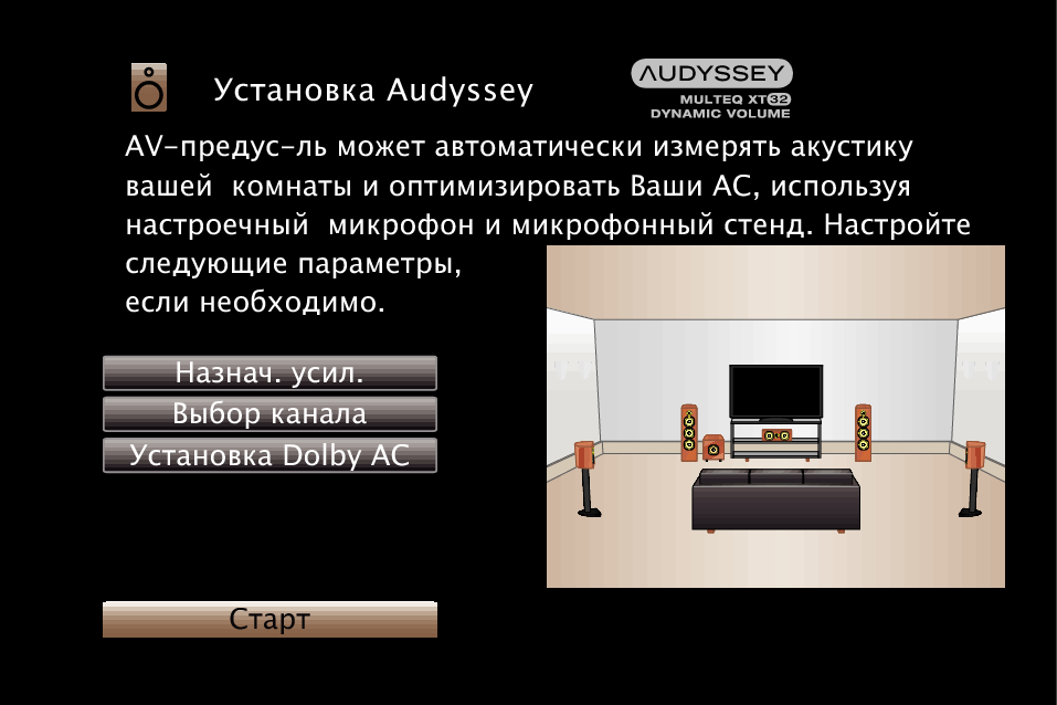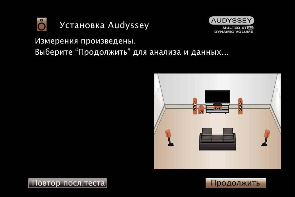 Не изменяйте соединение динамика или громкость сабвуфера после настройки Audyssey®. Если их изменили, запустите настройку Audyssey® снова для того, чтобы сконфигурировать оптимальные настройки эквалайзера.