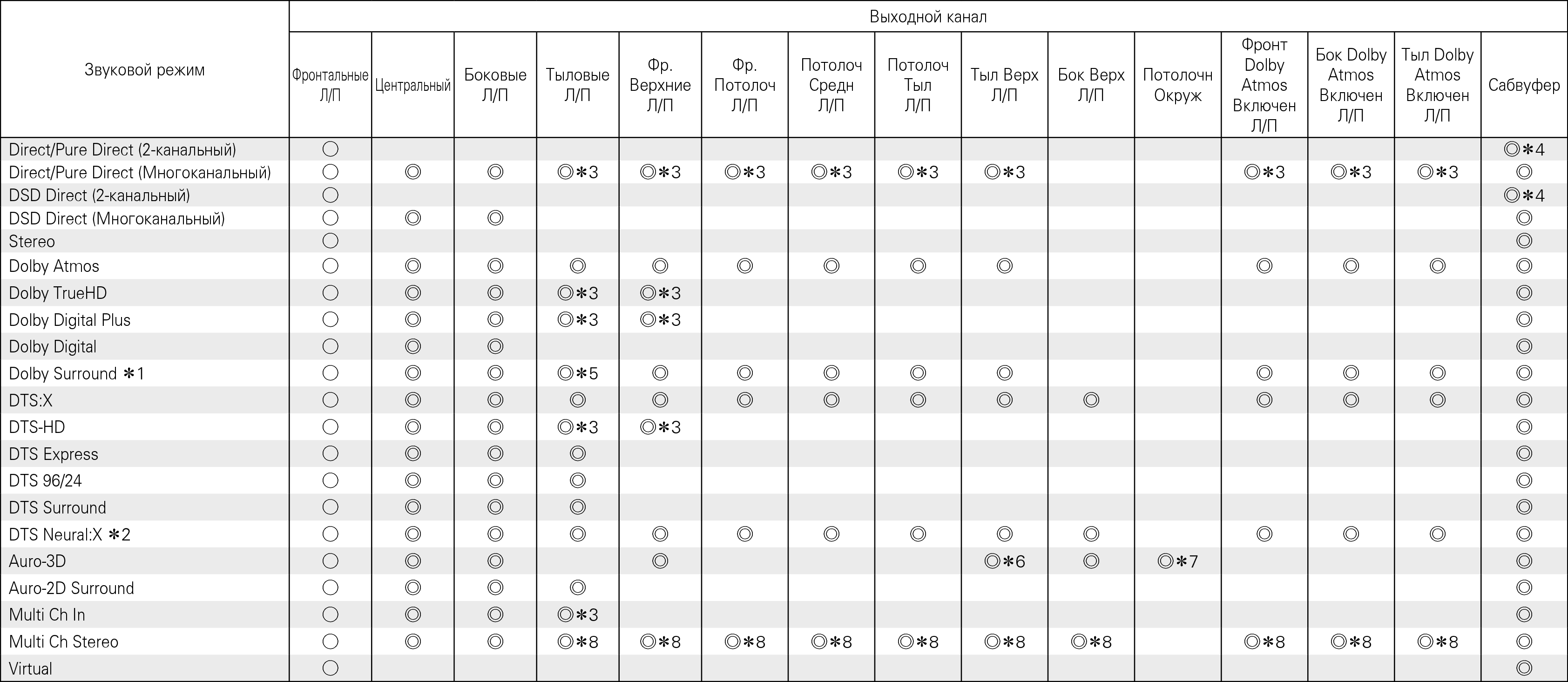 Указывает на выходные звуковые каналы. Выходные каналы зависят от настройки “Конфиг-ия АС”. ссылка