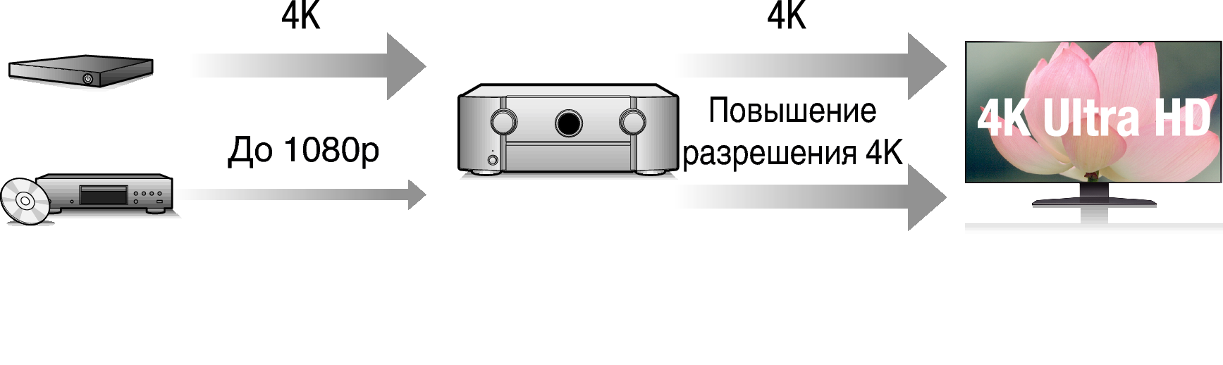 Когда используется 4K Ultra HD (High Definition), скорость входа/выхода 60 кадров в секунду (60p) достигается для видео сигналов. При подключении к 4K Ultra HD и телевизору, совместимому с входным видео сигналом 60р, Вы можете наслаждаться ощущением реальности, которое доступно только в изображениях с высоким разрешением, даже при просмотре быстро движущегося видео.