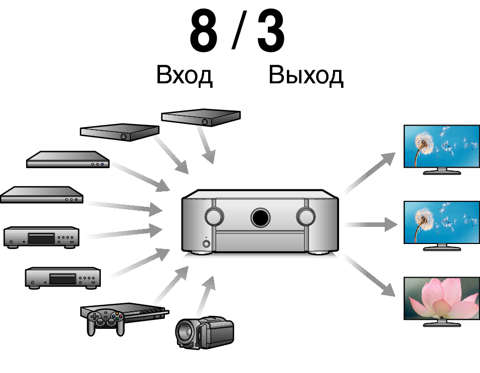 Разъемы HDMI позволяют подключать различные цифровые аудио- и видеоустройства (8 входов, 3 выхода)