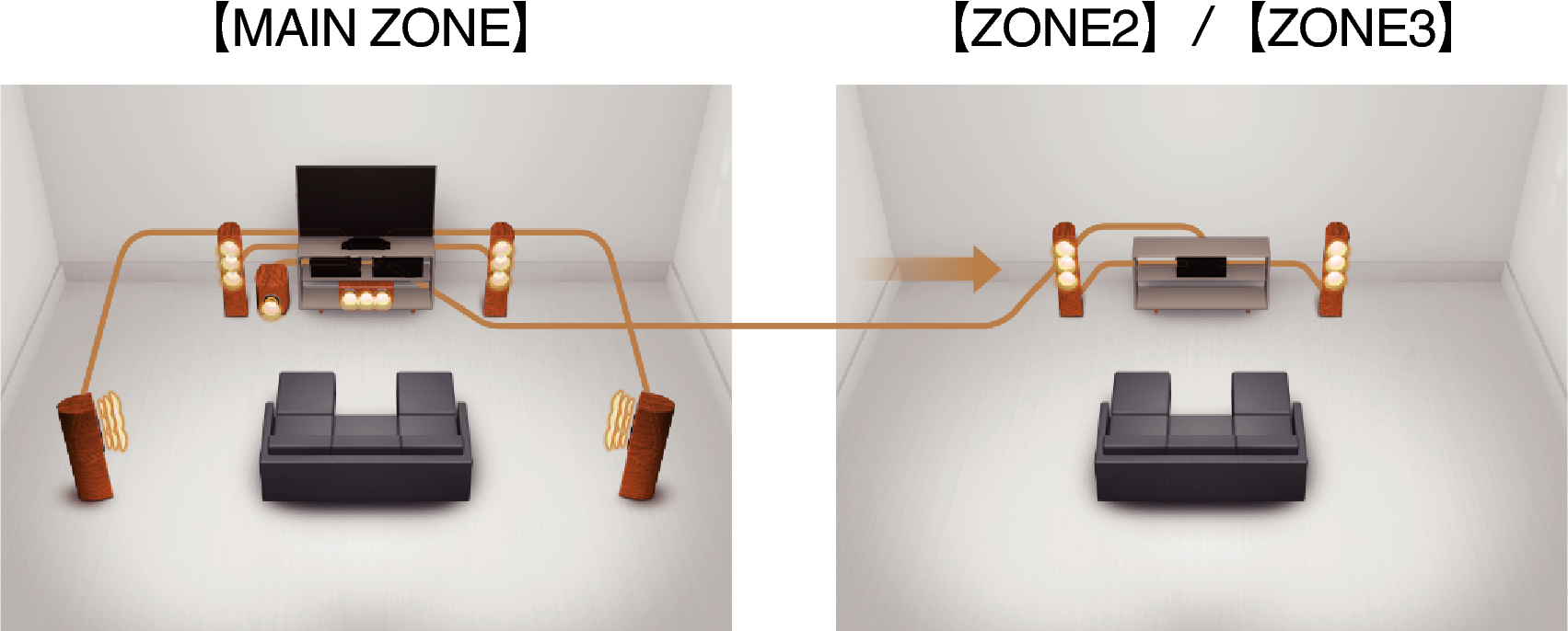 Выход ZONE2 на несколько комнат включает выход HDMI, который позволяет наслаждаться источником А/В в той комнате с другой воспроизводимой программой в главной комнате.