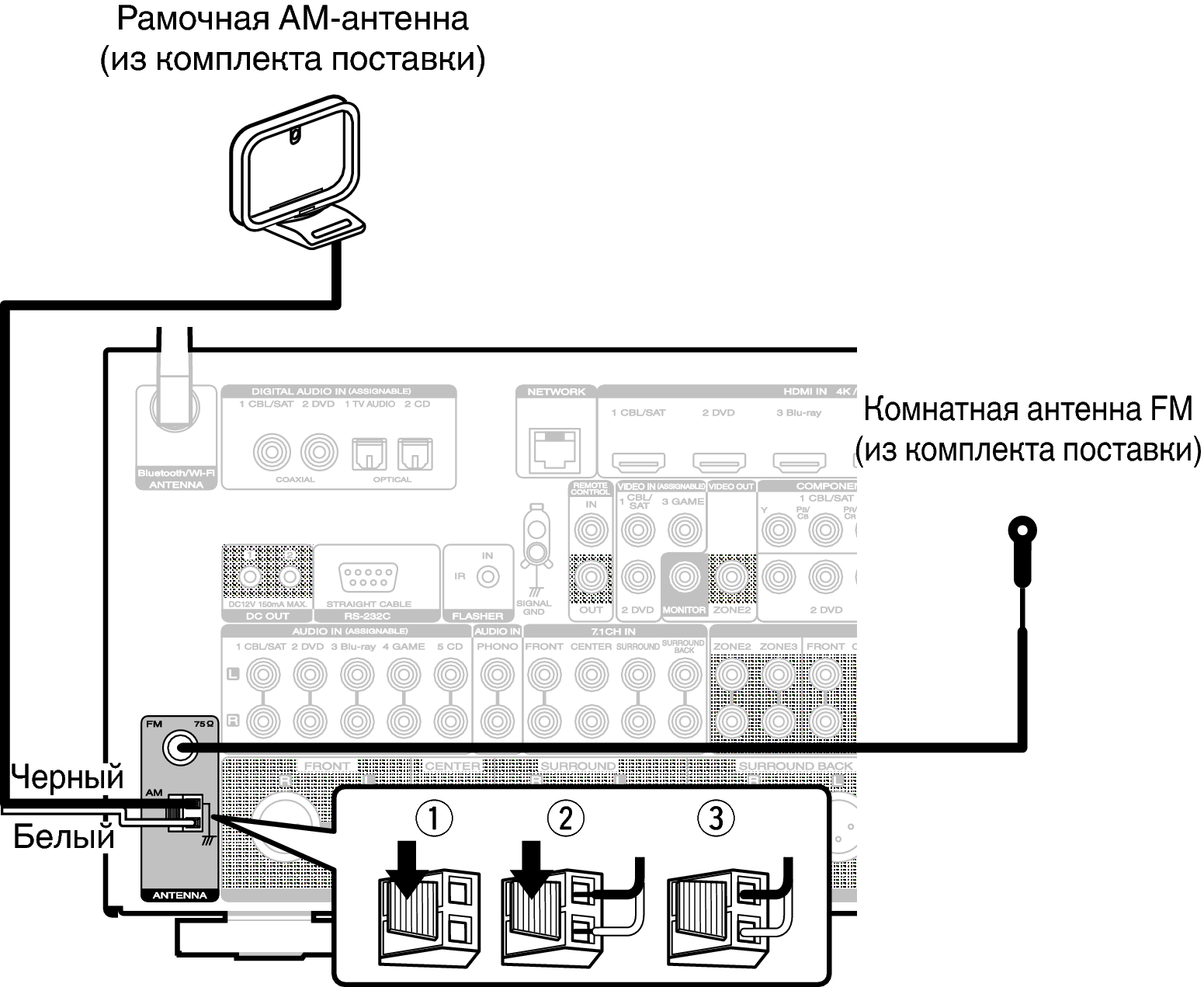 Подключите антенну, настройте ее на радиостанцию, а затем переместите антенну в место, где меньше всего шума. Затем используйте ленту и т.д., чтобы закрепить антенну в данном положении. (Прослушивание FM/AM-радиостанцийссылка)