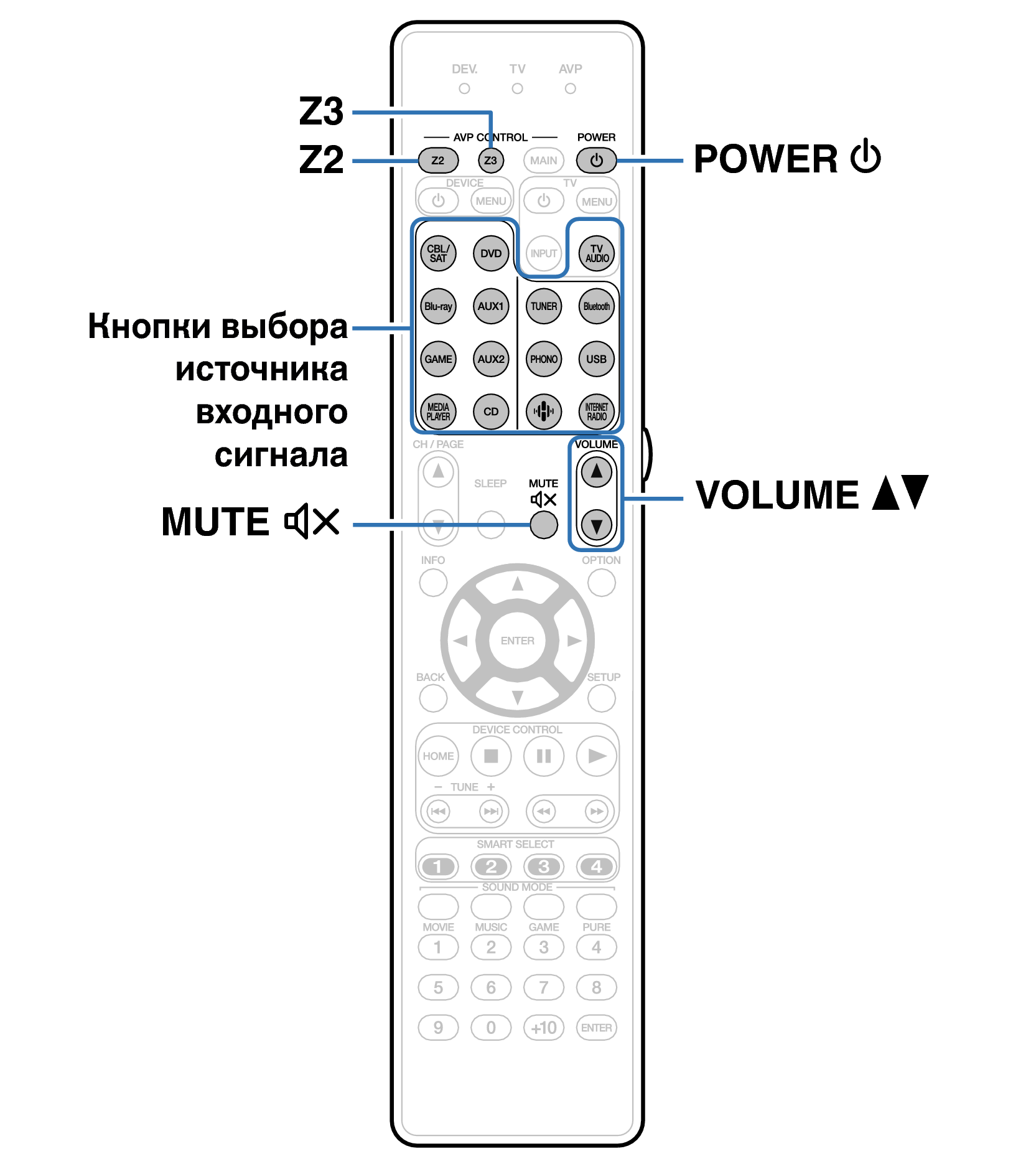 ZONE2 или ZONE3 можно также выбрать в качестве источника входного сигнала, нажав кнопку ZONE SELECT, а затем повернув ручку управления INPUT SELECTOR.