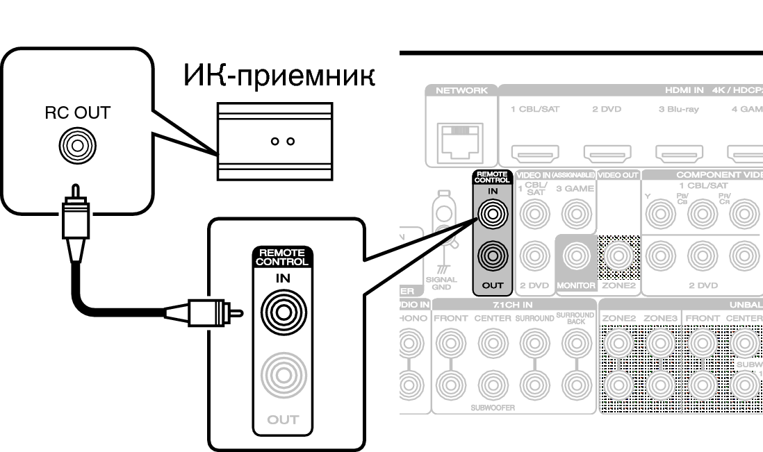 Для управления данным устройством без визуального контакта при помощи входящего в комплект пульта ДУ внешний ИК-приемник можно подключить к разъемам REMOTE CONTROL. Это необходимо в том случае, если устройство расположено в шкафу или в углу и недоступно для сигнала пульта ДУ.