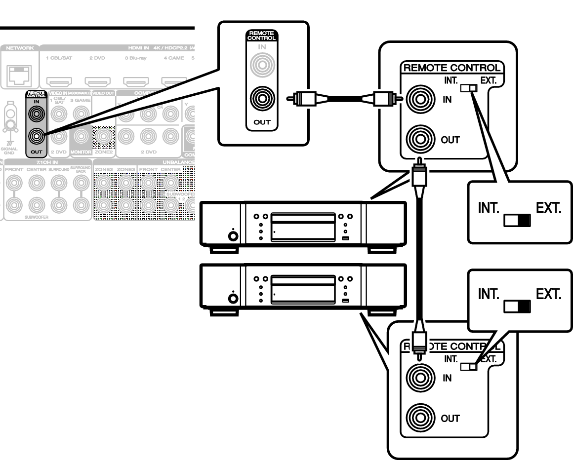 При использовании других устройств Marantz, поддерживающих удаленное подключение, для передачи сигнала пульта ДУ необходимо подключить устройство к разъему REMOTE CONTROL IN/OUT с помощью монофонического кабеля.