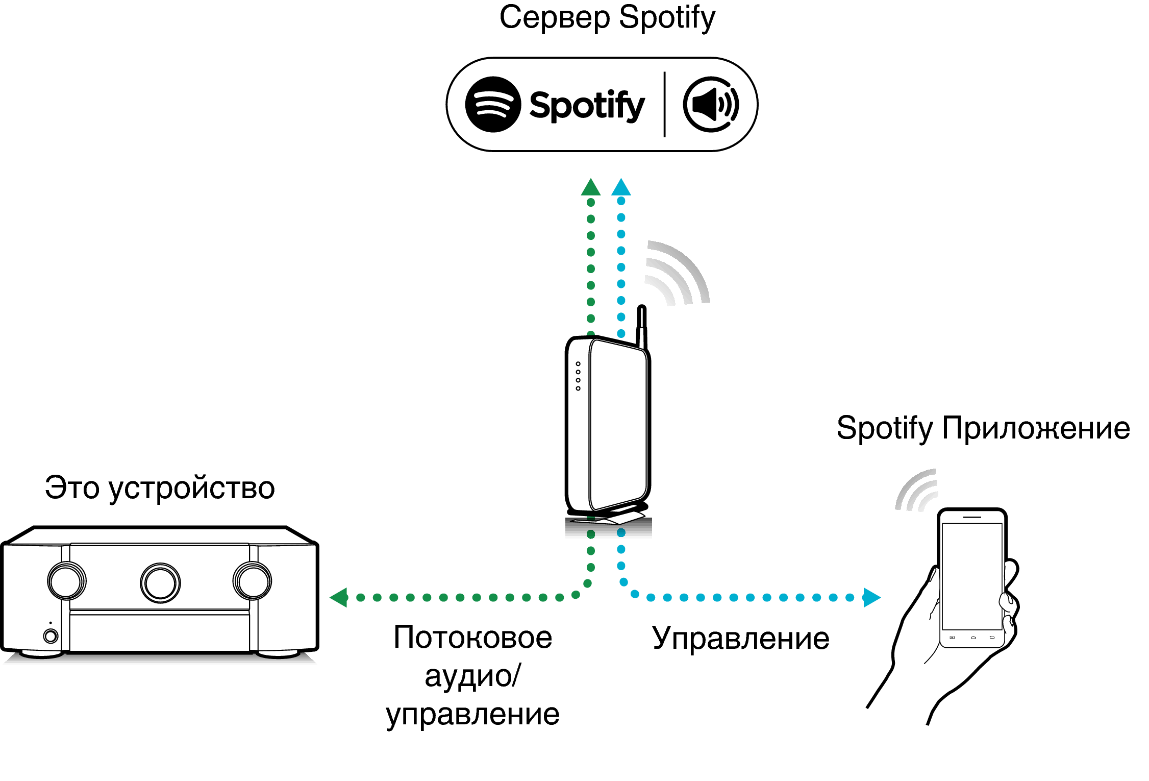 Spotify является самой популярной в мире службой потоковой передачи. Если Вы подпишитесь на Spotify Premium, Вы сможете управлять Вашей новой акустической системой при помощи Вашего телефона или планшета. Поскольку Spotify встроен в акустическую систему, Вы сможете делать звонки или использовать другие приложения - музыка никогда не остановится.