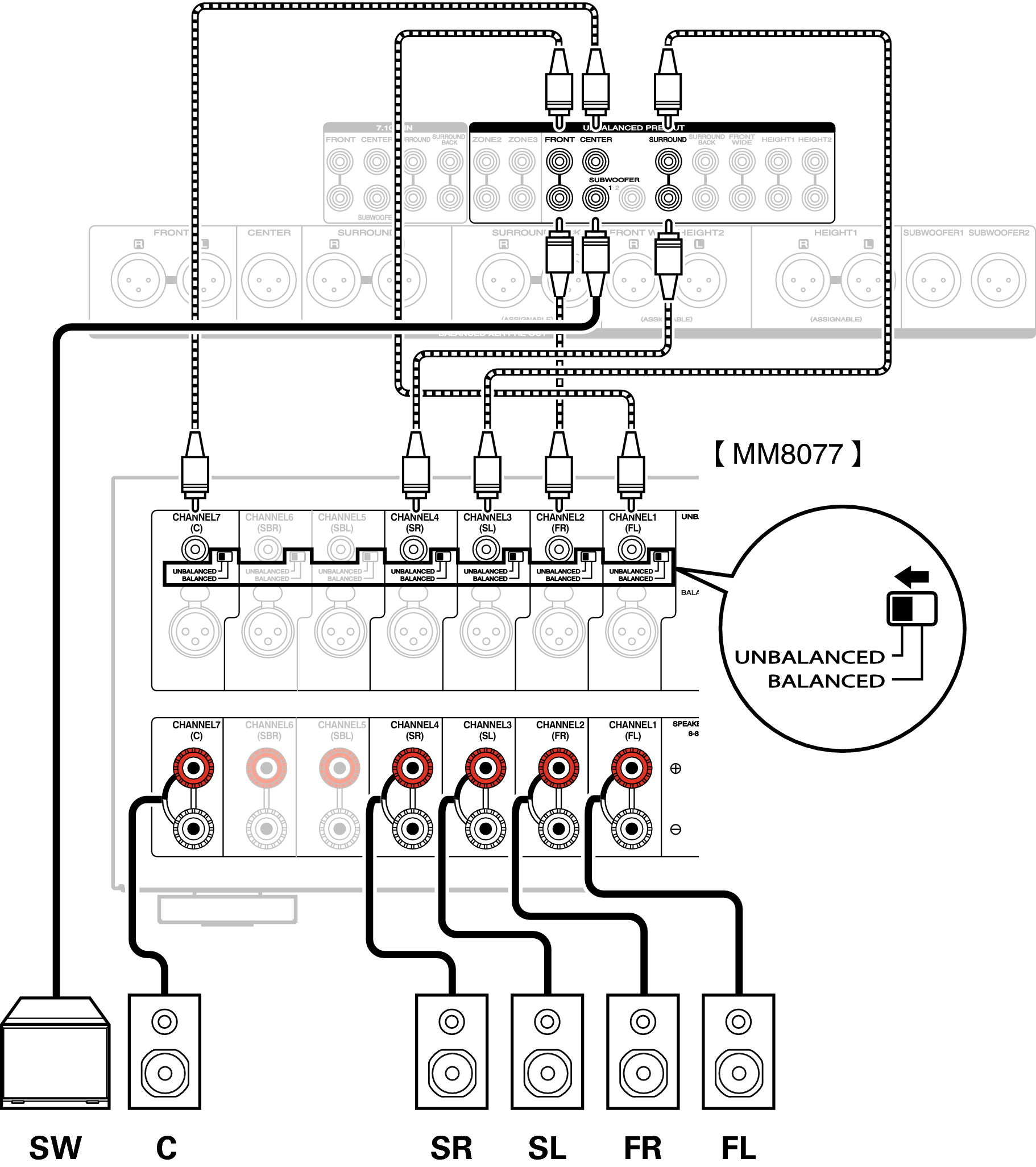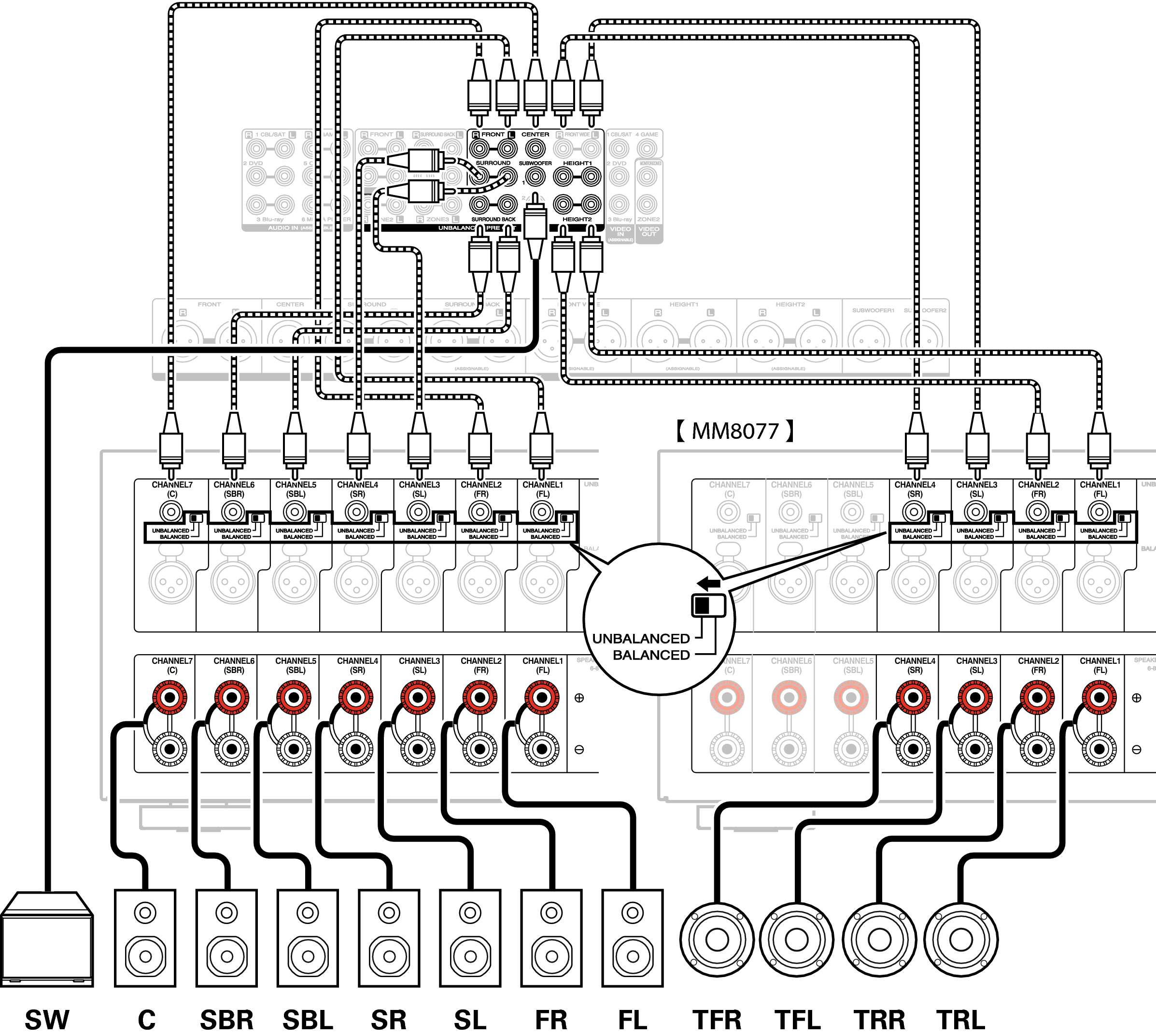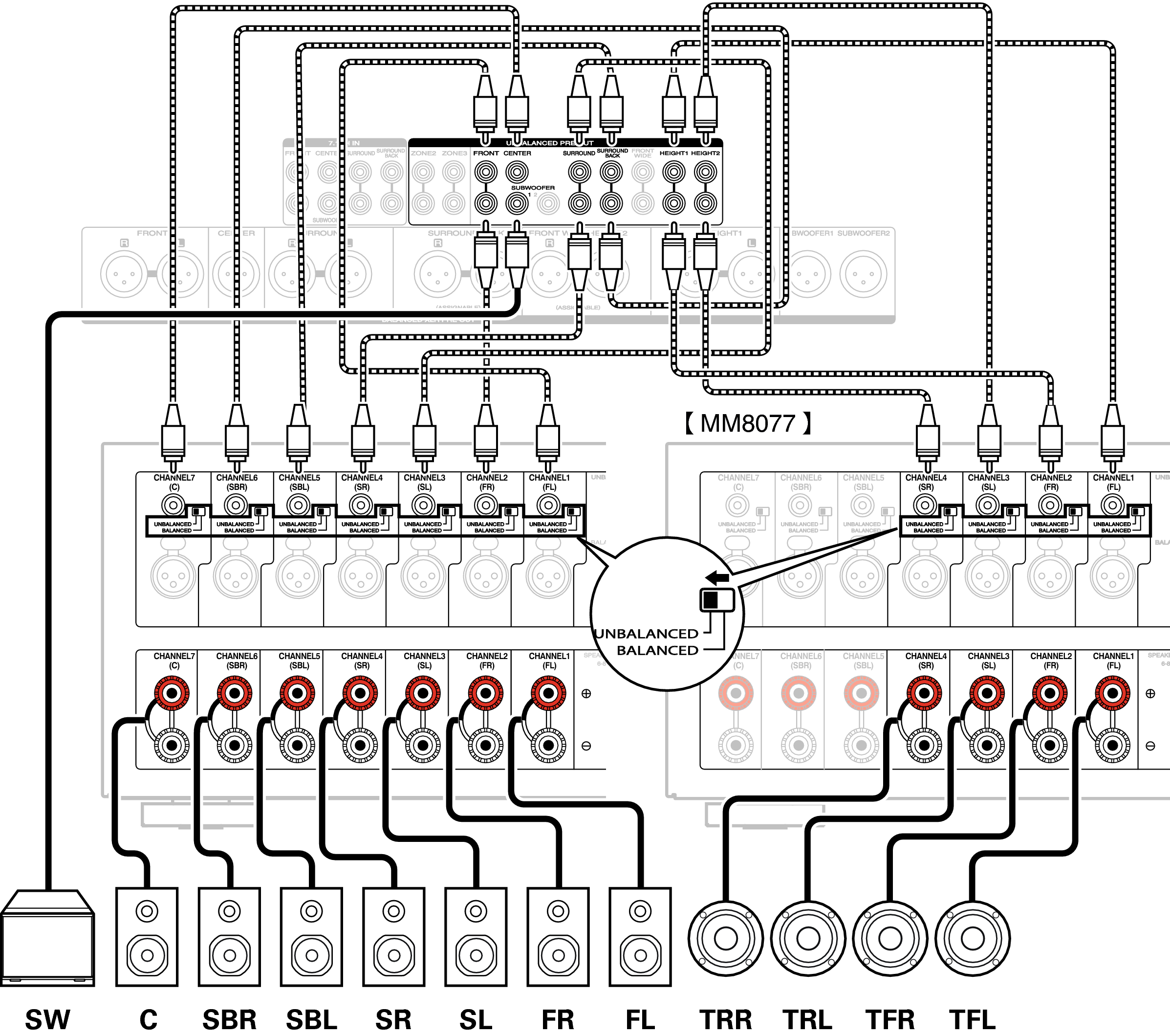 Lors de l’utilisation des connecteurs UNBALANCED RCA pour la connexion, réglez le commutateur de changement d’entrée sur “UNBALANCED” sur MM8077.