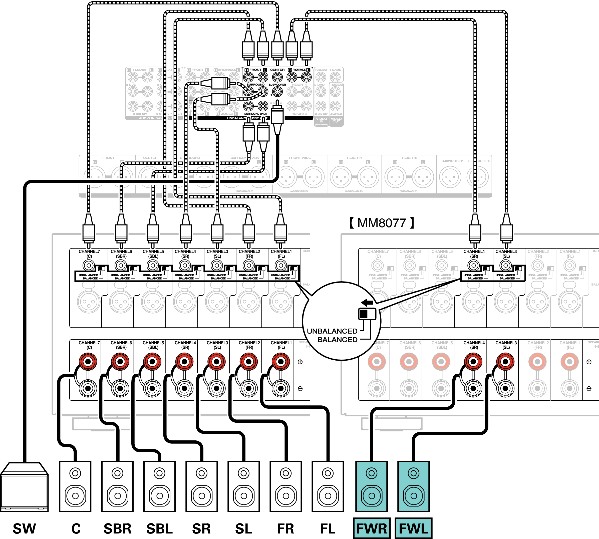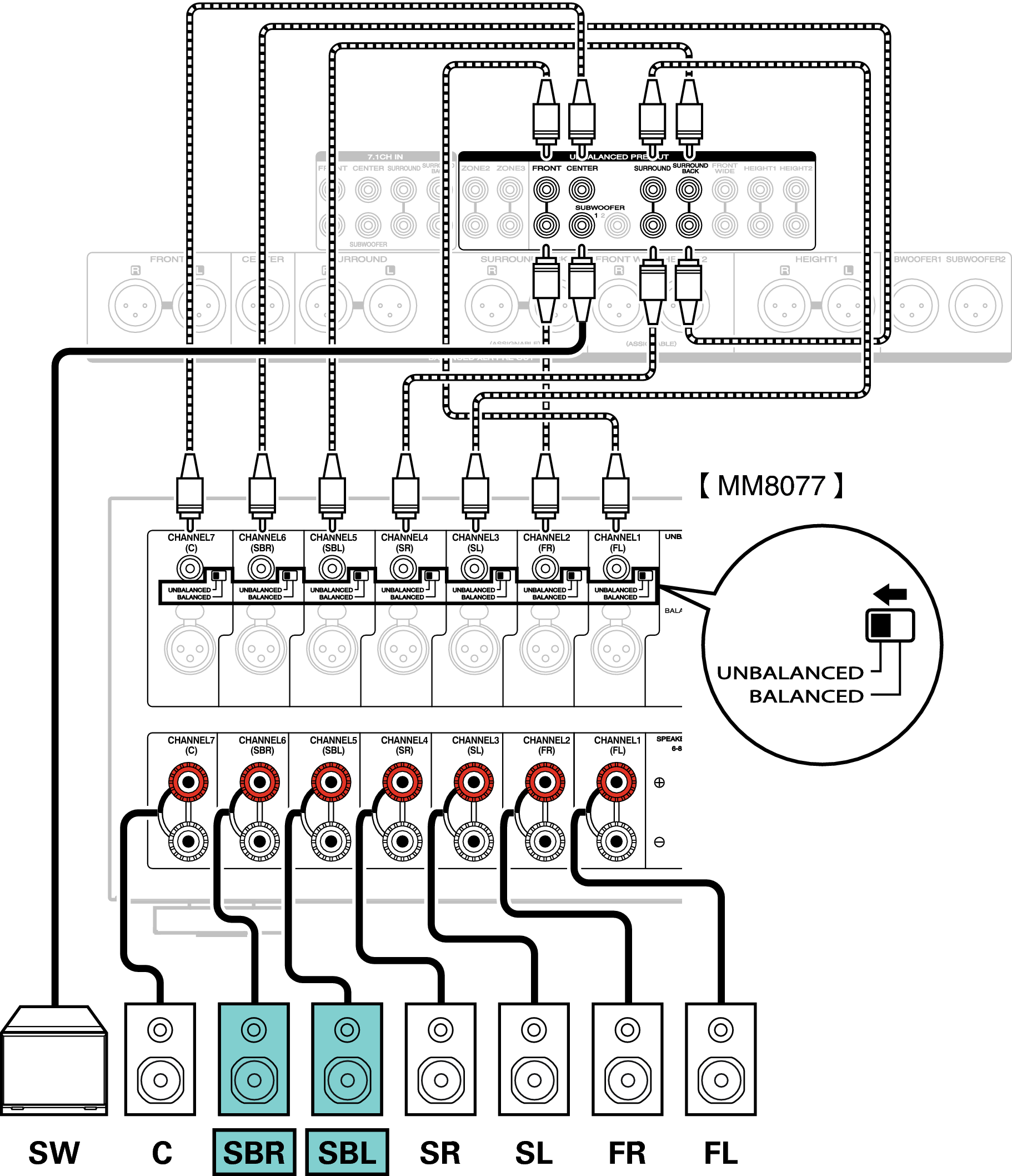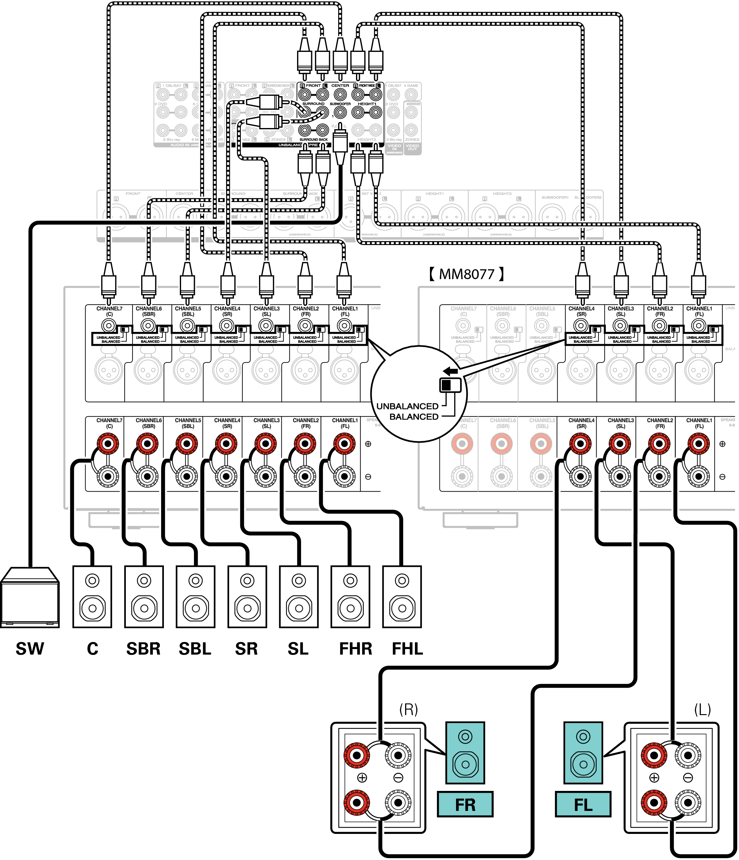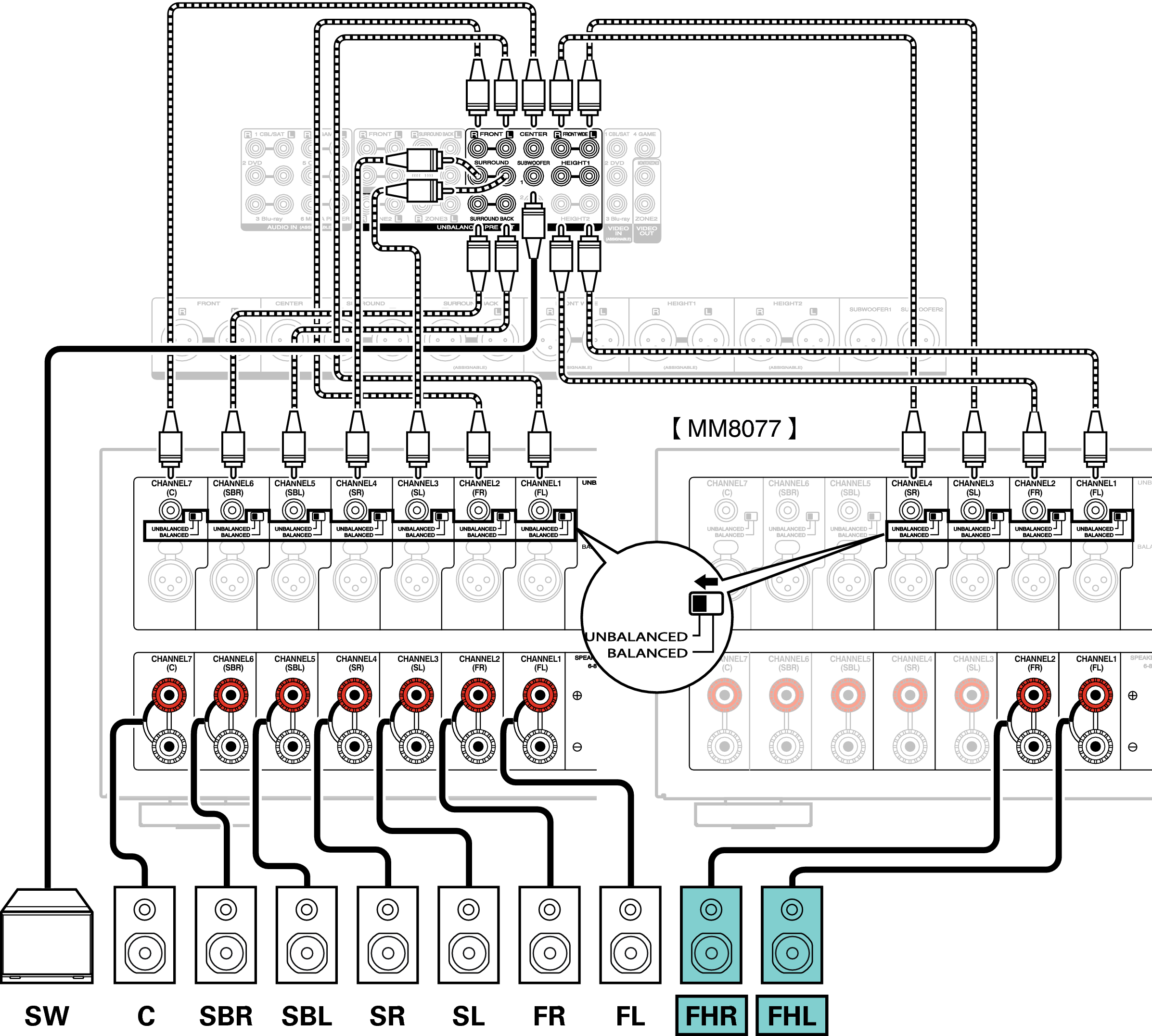 Lors de l’utilisation des connecteurs UNBALANCED RCA pour la connexion, réglez le commutateur de changement d’entrée sur “UNBALANCED” sur MM8077.