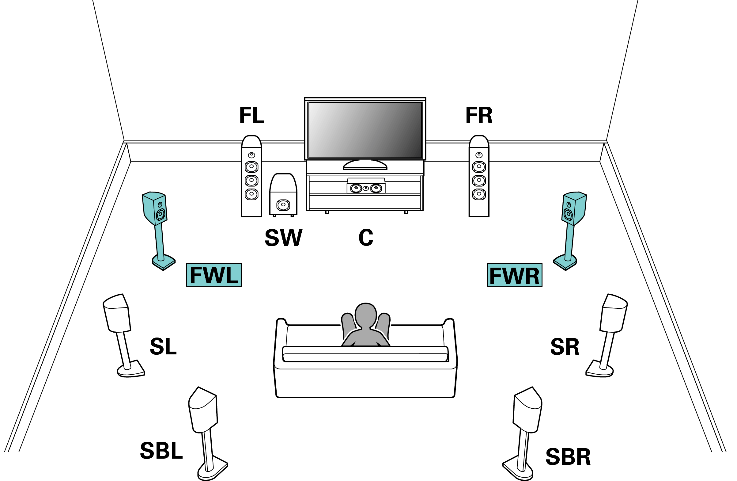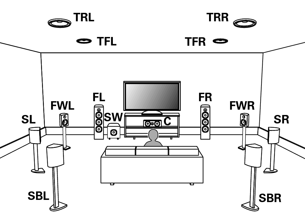 Pour bénéficier d’une expérience Auro-3D optimale, il est recommandé d’utiliser des enceintes surround hautes ; toutefois, vous pouvez remplacer les enceintes surround hautes par les enceintes arrière hautes d’une configuration d’enceintes Dolby Atmos.