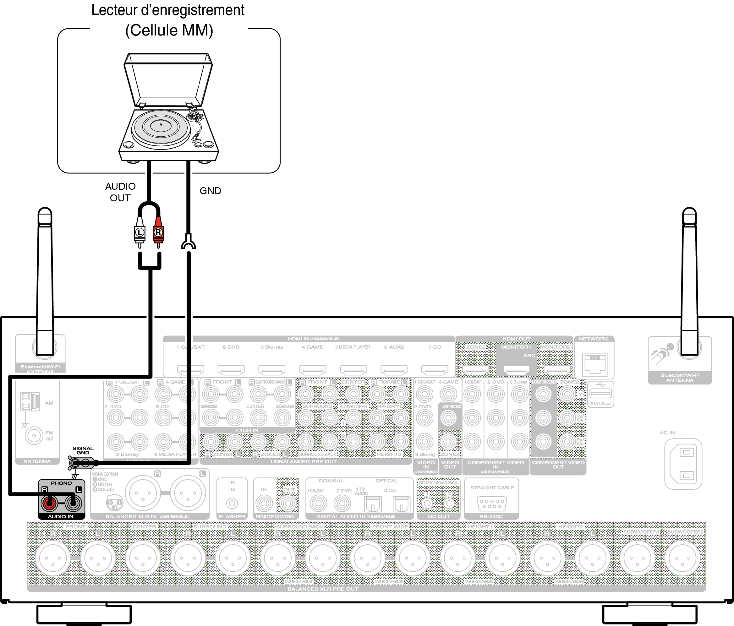Cet appareil est compatible avec les platines équipées d’une cellule phono avec aimant tournant. Si vous le connectez à une platine dotée d’une cellule MC à faible sortie, utilisez un amplificateur de tête MC ou un transformateur survolteur du commerce.