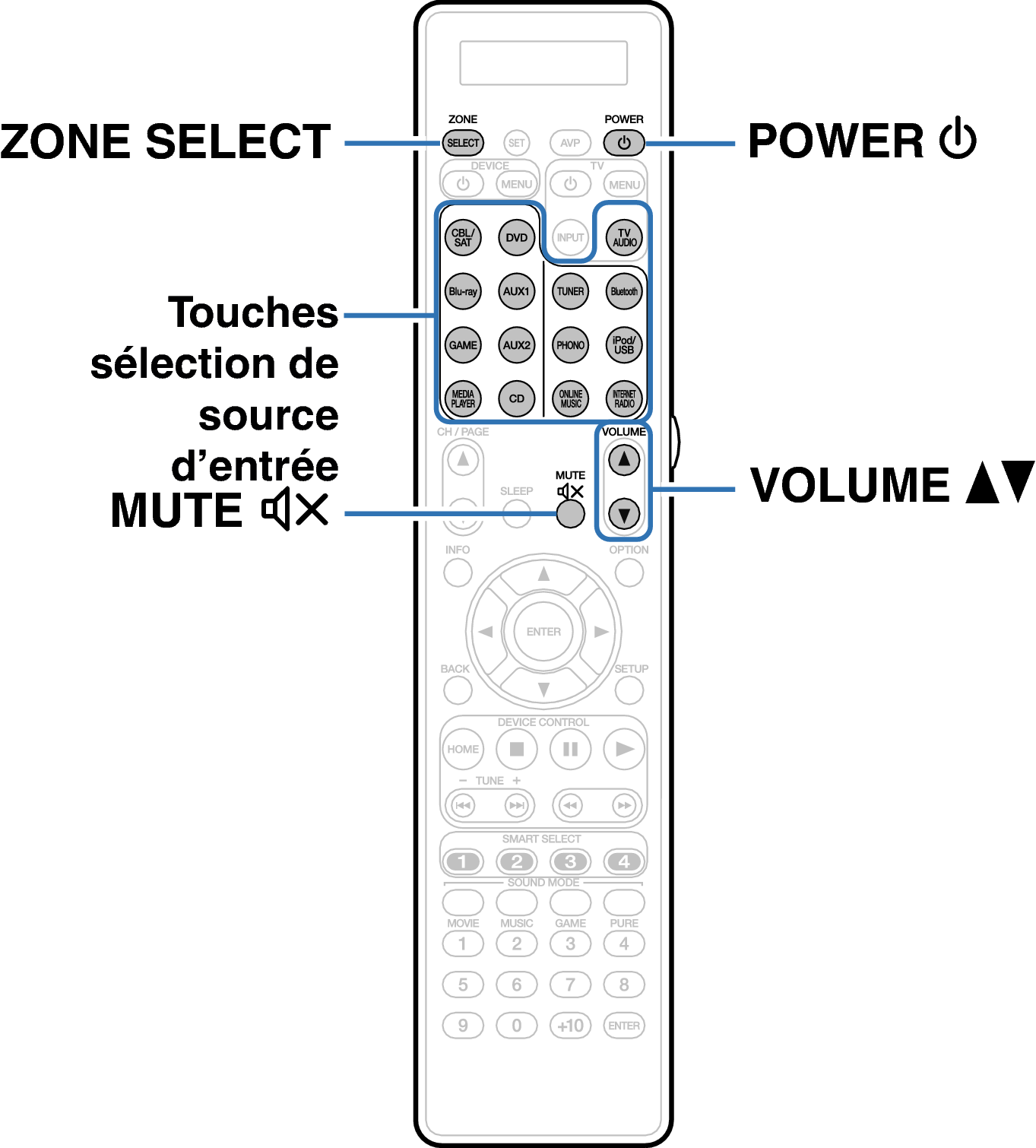 Pour effectuer une opération avec l’appareil principal, appuyez sur ZONE SELECT. Chaque fois que vous appuyez sur ZONE SELECT, la source d’entrée change.