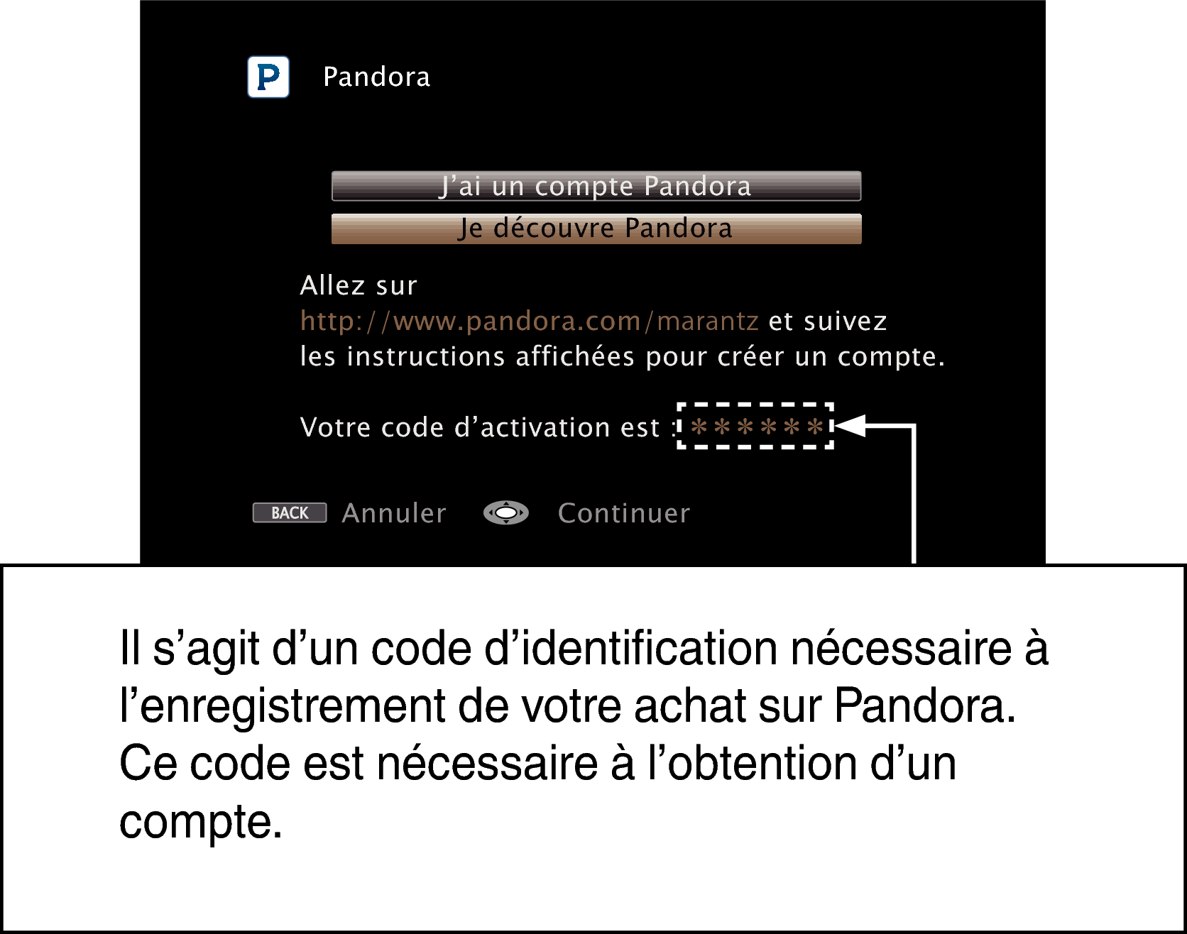 pour sélectionner “J’ai un compte Pandora”, puis appuyez sur ENTER.Si vous ne disposez pas de compte Pandora, appuyez sur ENTER pour sélectionner “I am to new to Pandora”. L’URL de Pandora et le code d’activation s’affichent. Accédez à la page Web de Pandora à partir de votre ordinateur et enregistrez le code d’activation affiché et les informations du compte. Ensuite, appuyez sur ENTER.