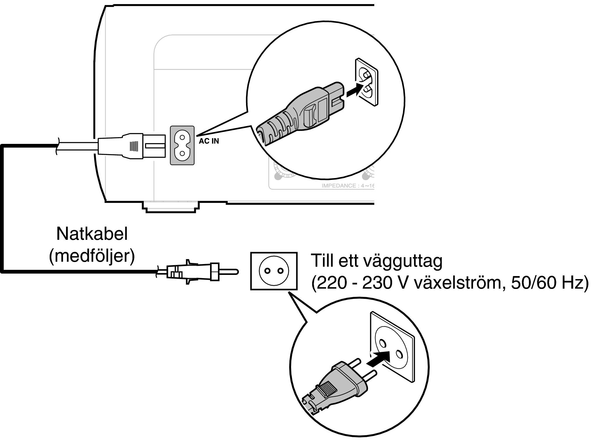 Anslut nätkabeln till ett vägguttag när alla anslutningar är klara.