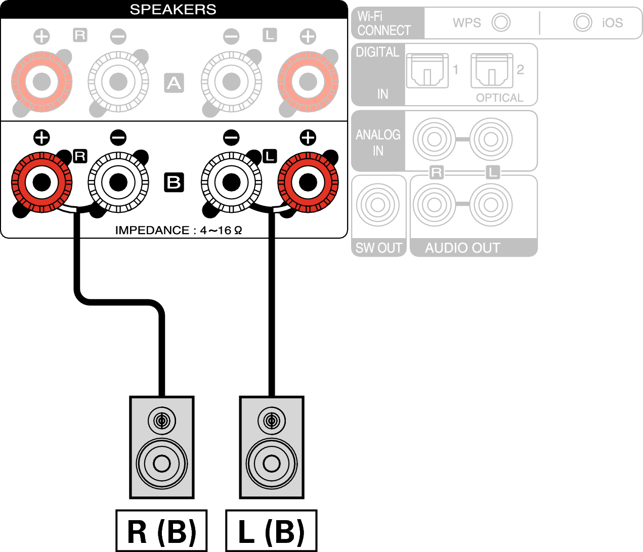 Genom att ansluta högtalare till både B-högtalaranslutningarna och A-högtalaranslutningarna kan anslutningen av flera högtalarpar användas och du kan spela upp från separata högtalarpar eller båda. länk