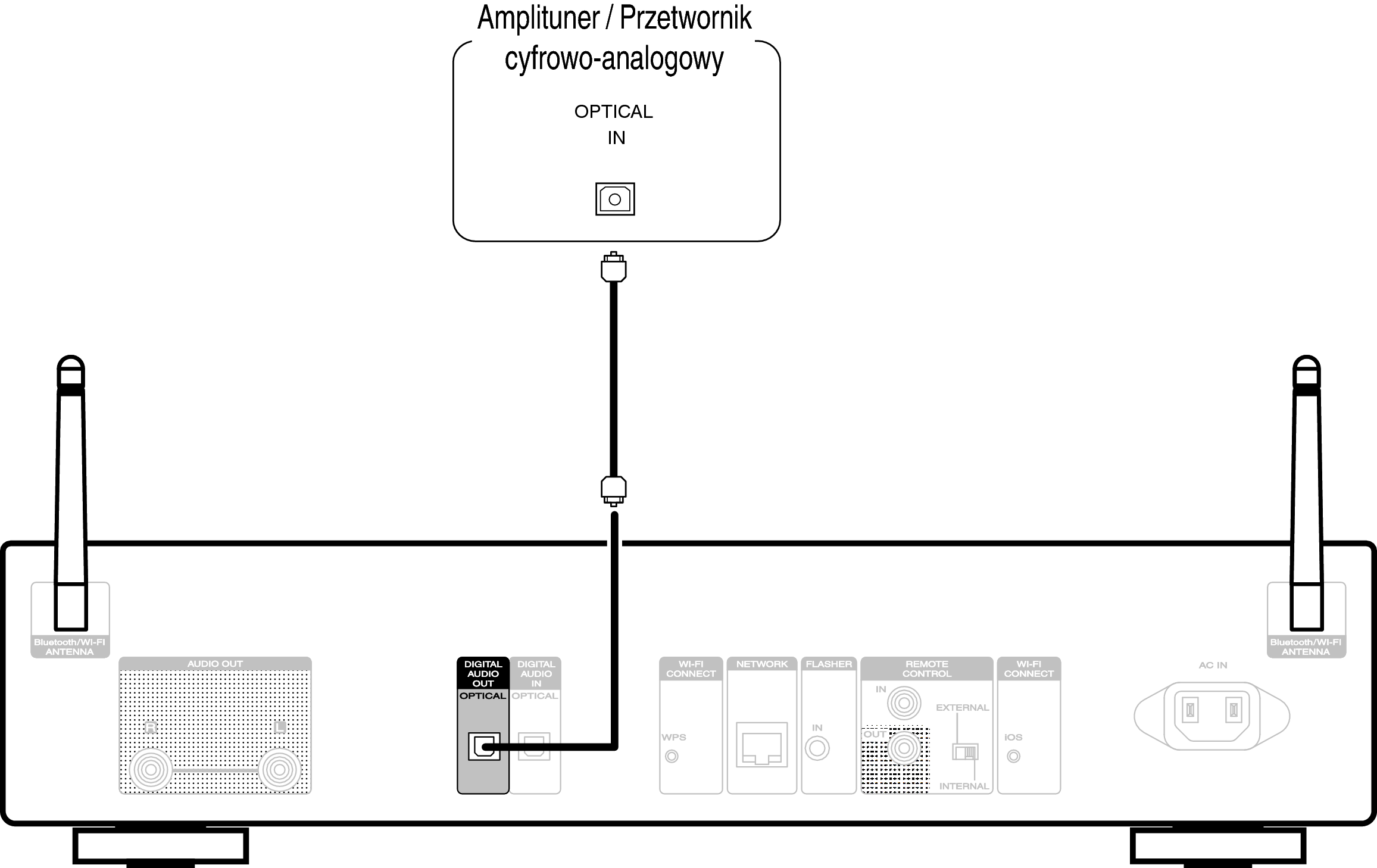To podłączenie umożliwia przesyłanie cyfrowych sygnałów audio z tego urządzenia, a także konwersję sygnałów w celu odtwarzania przy użyciu przetwornika cyfrowo/analogowego podłączonego urządzenia.