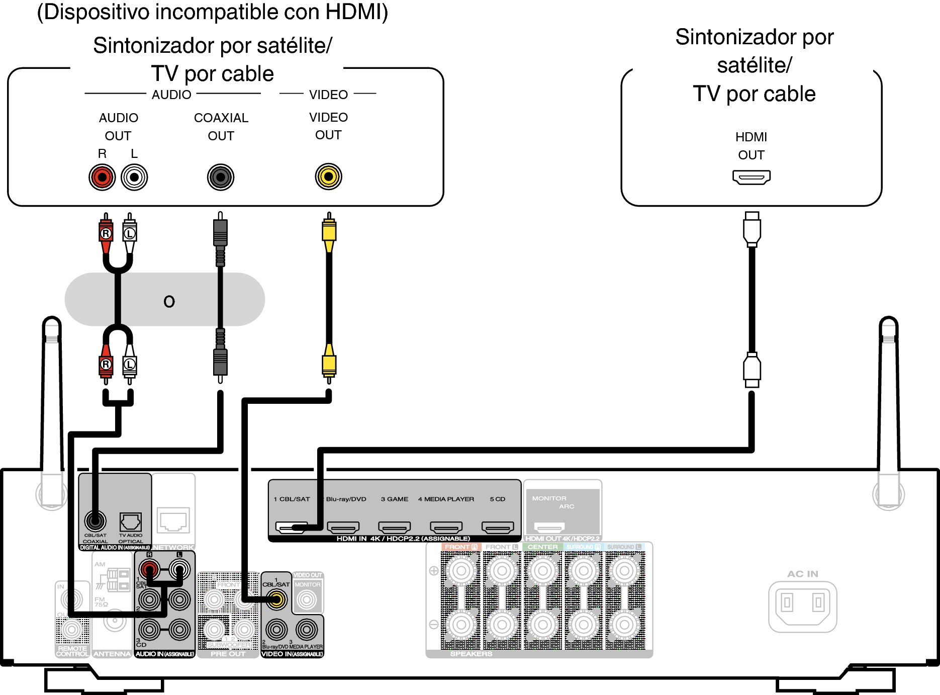 En esta explicación se incluye la conexión con un sintonizador de TV por satelite/por cable como ejemplo.