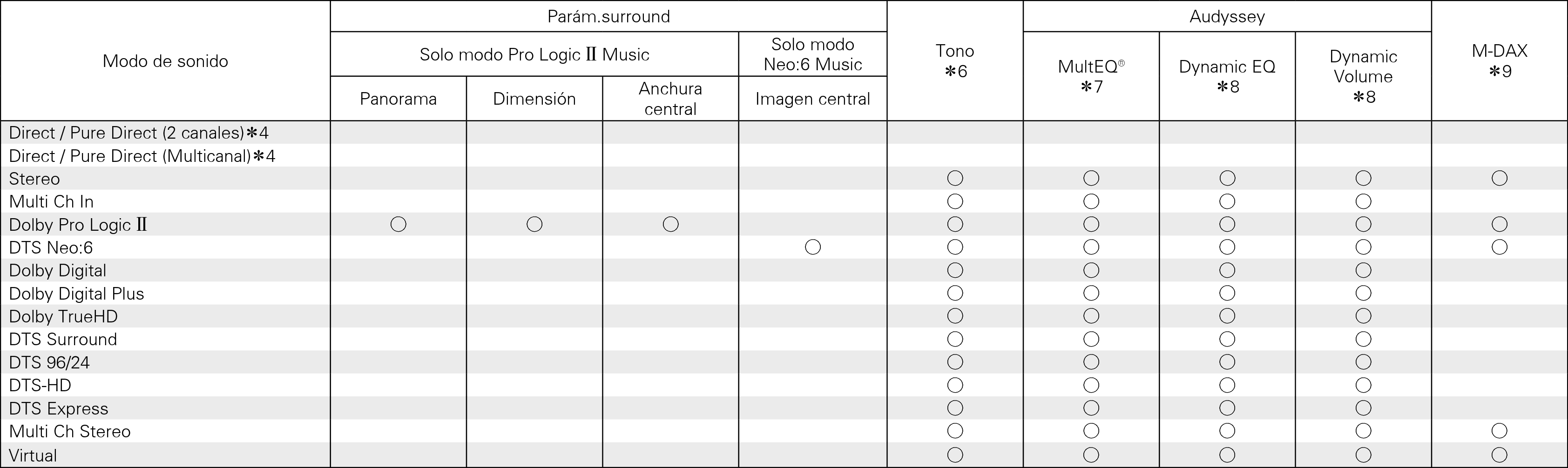 Durante la reproducción en modo Pure Direct, los parámetros de sonido surround son los mismos que en el modo Direct.
