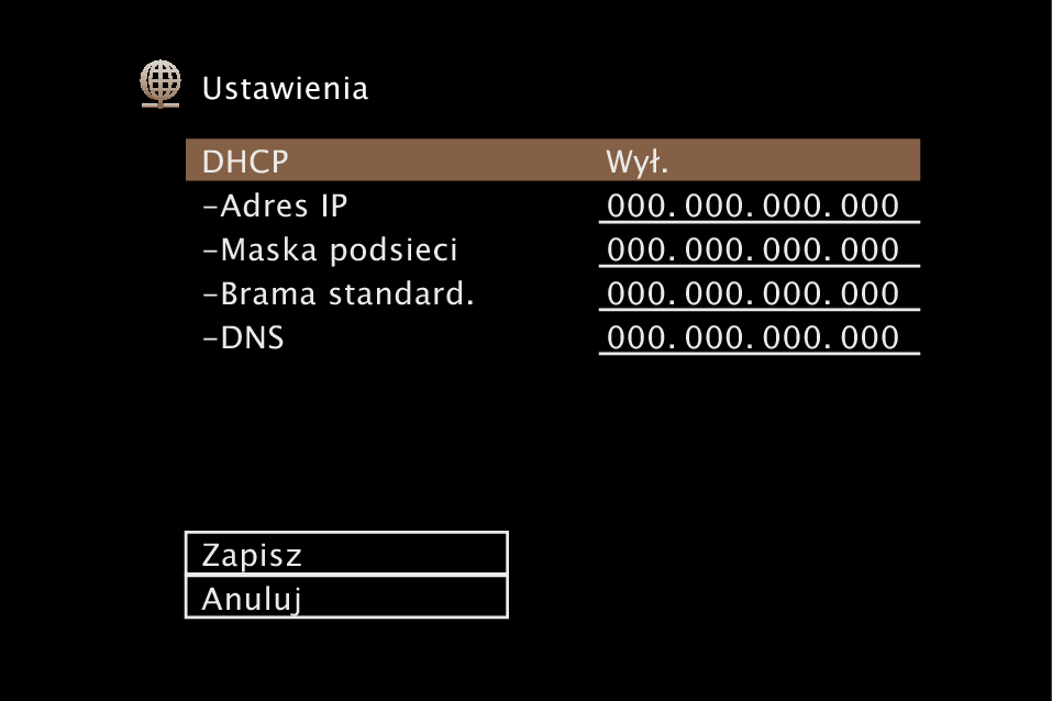 Wprowadzaj informacje o Adres IP, Maska podsieci, Brama standardowa i serwerze DNS, tylko podczas przypisywania stałego adresu IP lub łączenia z siecią bez funkcji DHCP.
