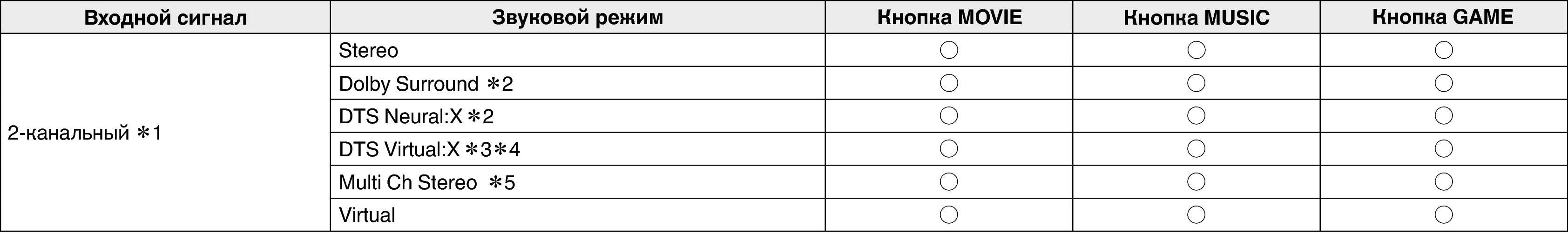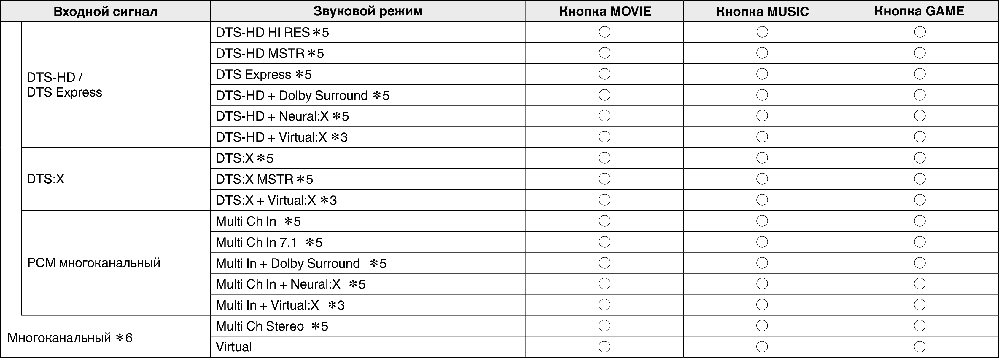 Режим звука, который можно выбрать, отличается в зависимости от аудио формата входного сигнала и количества каналов. Подробные сведения см. в разделе Типы входных сигналов и соответствующие режимы воспроизведения звукассылка.