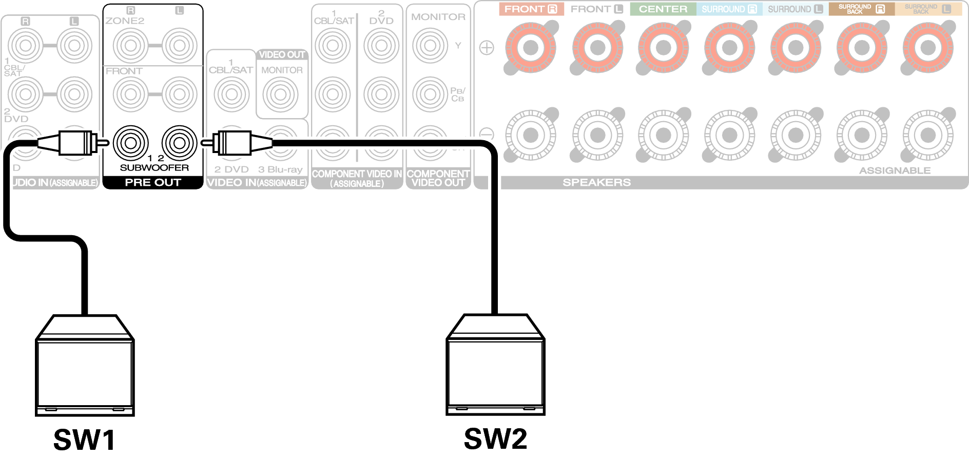 Utilisez un câble adapté pour connecter le subwoofer. Il est possible de raccorder deux subwoofers à cet appareil.
