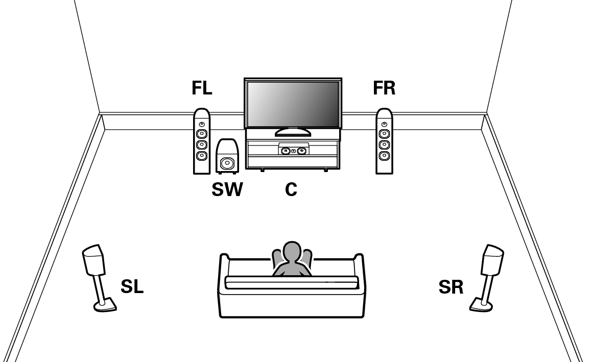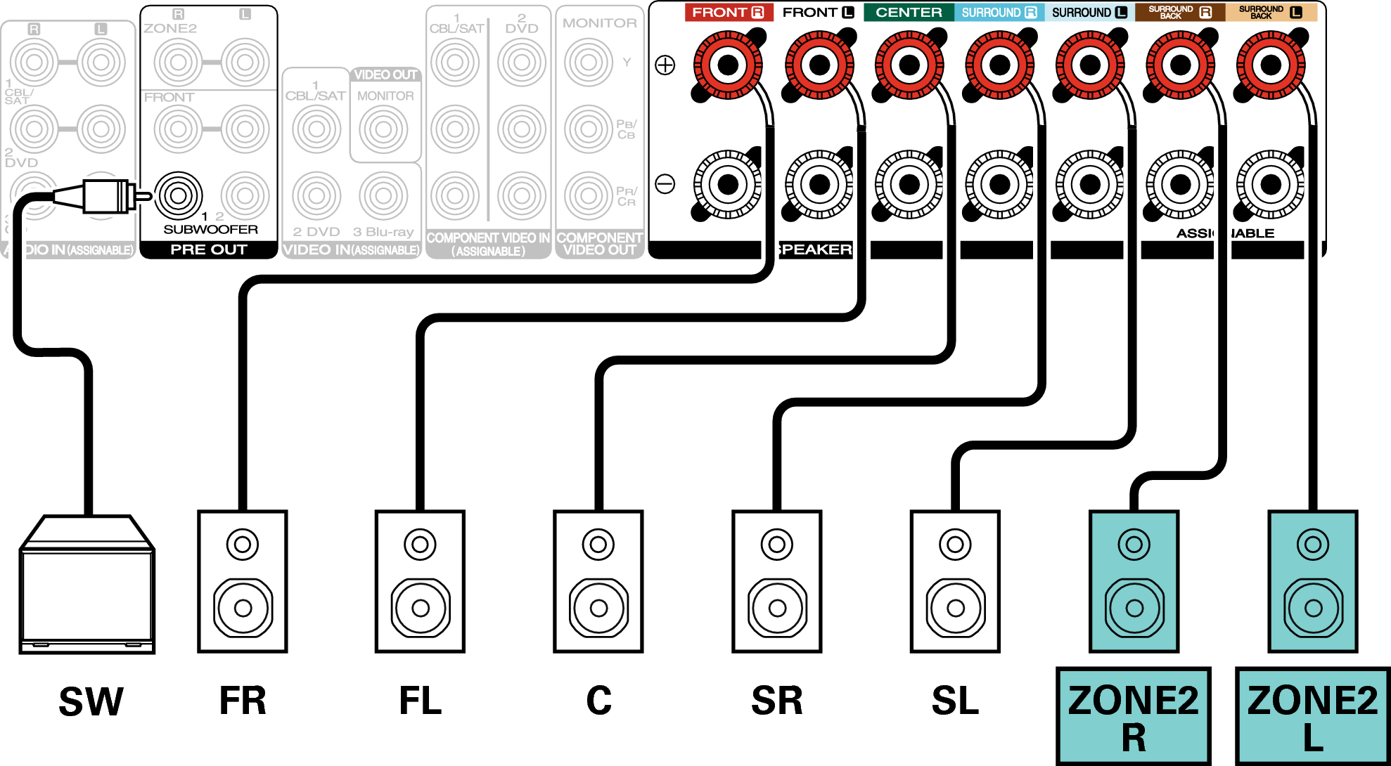 Cette méthode de connexion construit un système d’enceinte à canaux 5.1 dans la MAIN ZONE et un système à 2 canaux dans la ZONE2.