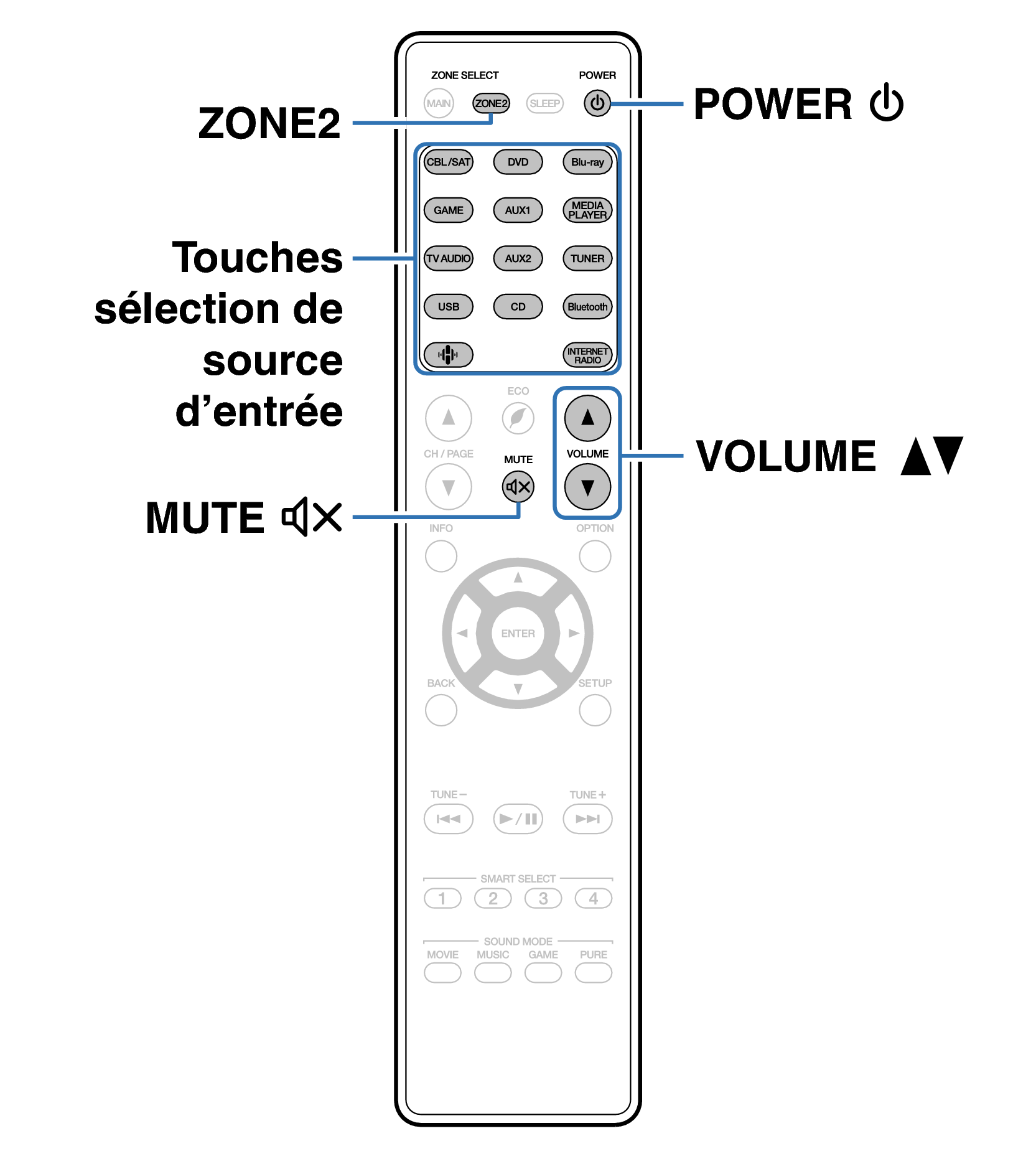 Il est possible de mettre sous tension et hors tension la ZONE2 en appuyant sur ZONE2 ON/OFF directement sur l’appareil.