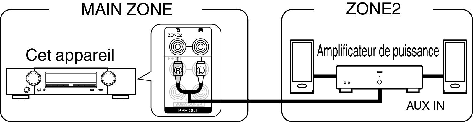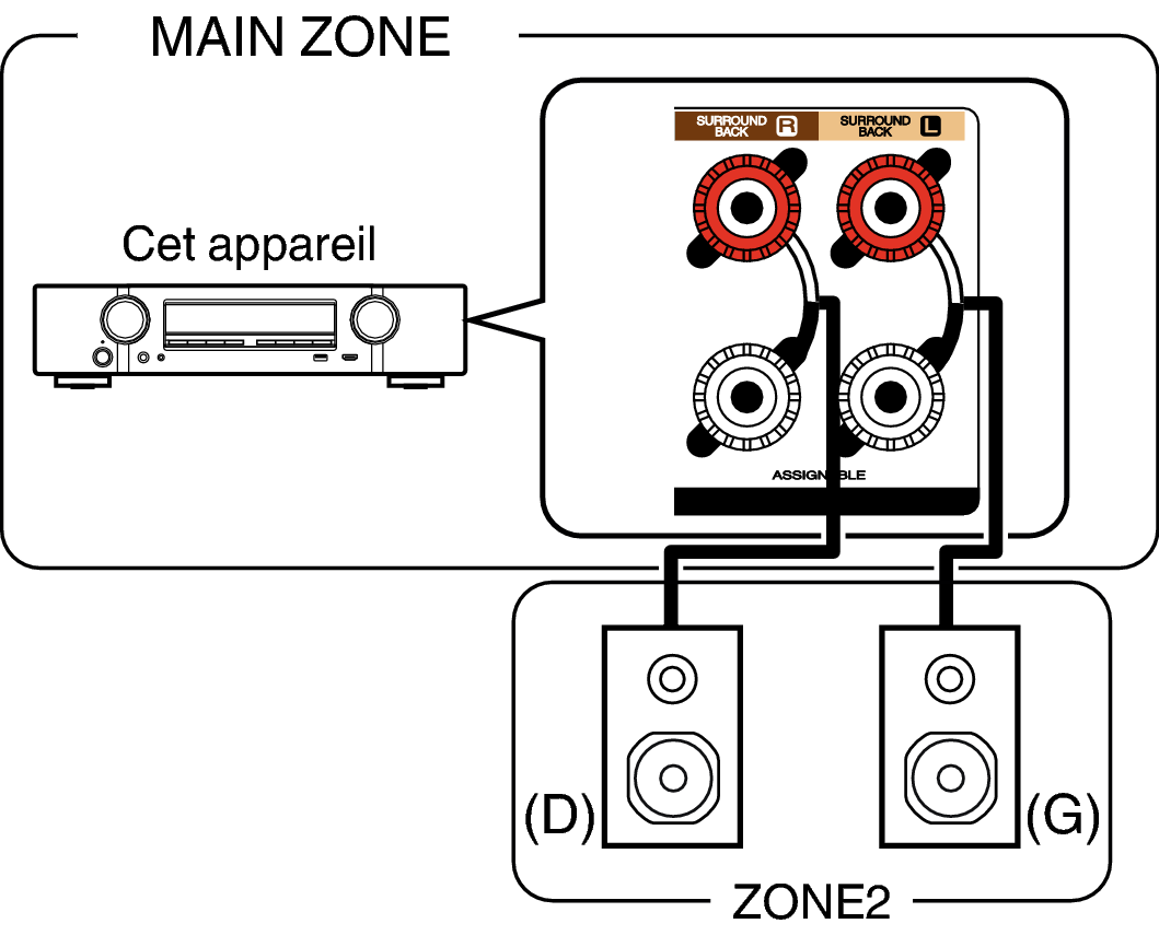 Les signaux audio des terminaux de sortie audio des ZONE2 de cet appareil sont émis vers les amplificateurs des ZONE2 et sont lus sur ces mêmes amplificateurs.