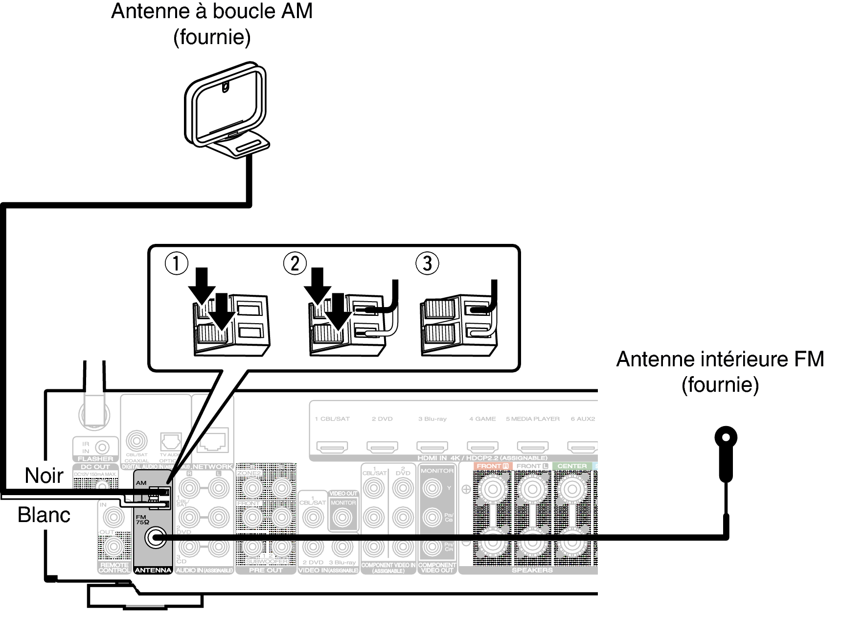 Assurez-vous que les bornes des fils de l’antenne à boucle AM n’entrent pas en contact avec les parties métalliques du panneau.