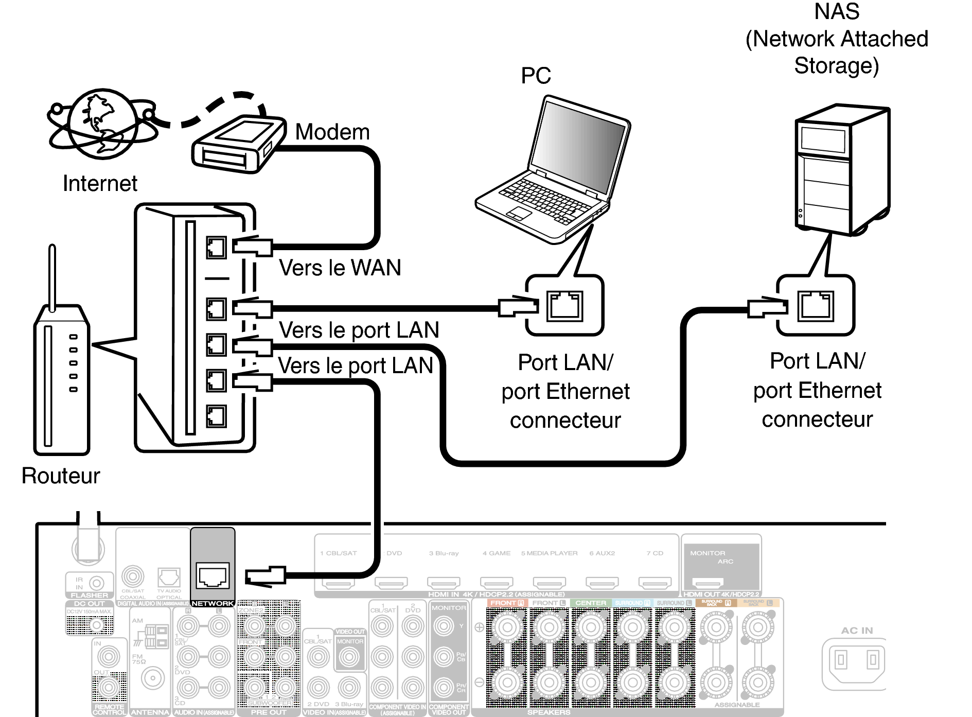 Pour effectuer des connexions via un LAN câblé, utilisez un câble LAN pour connecter le routeur à cet appareil, comme illustré dans la figure ci-dessous.