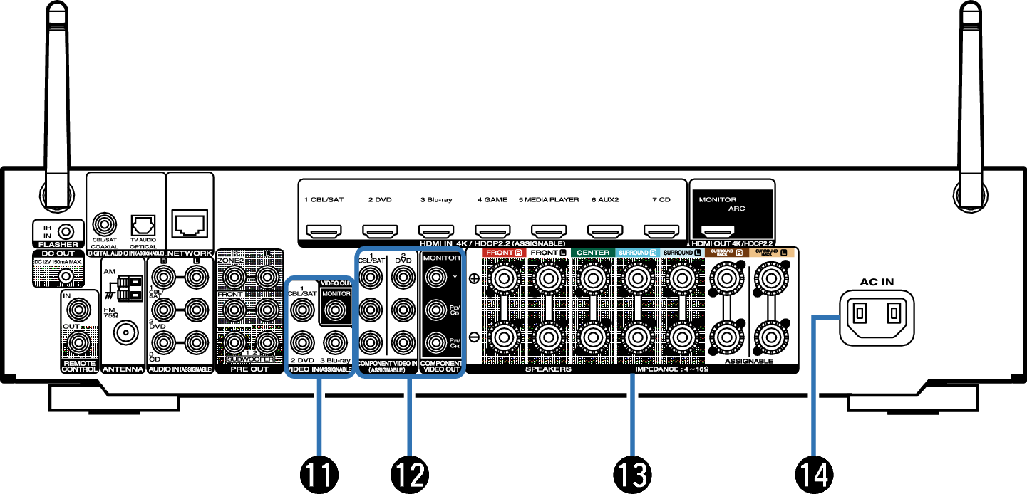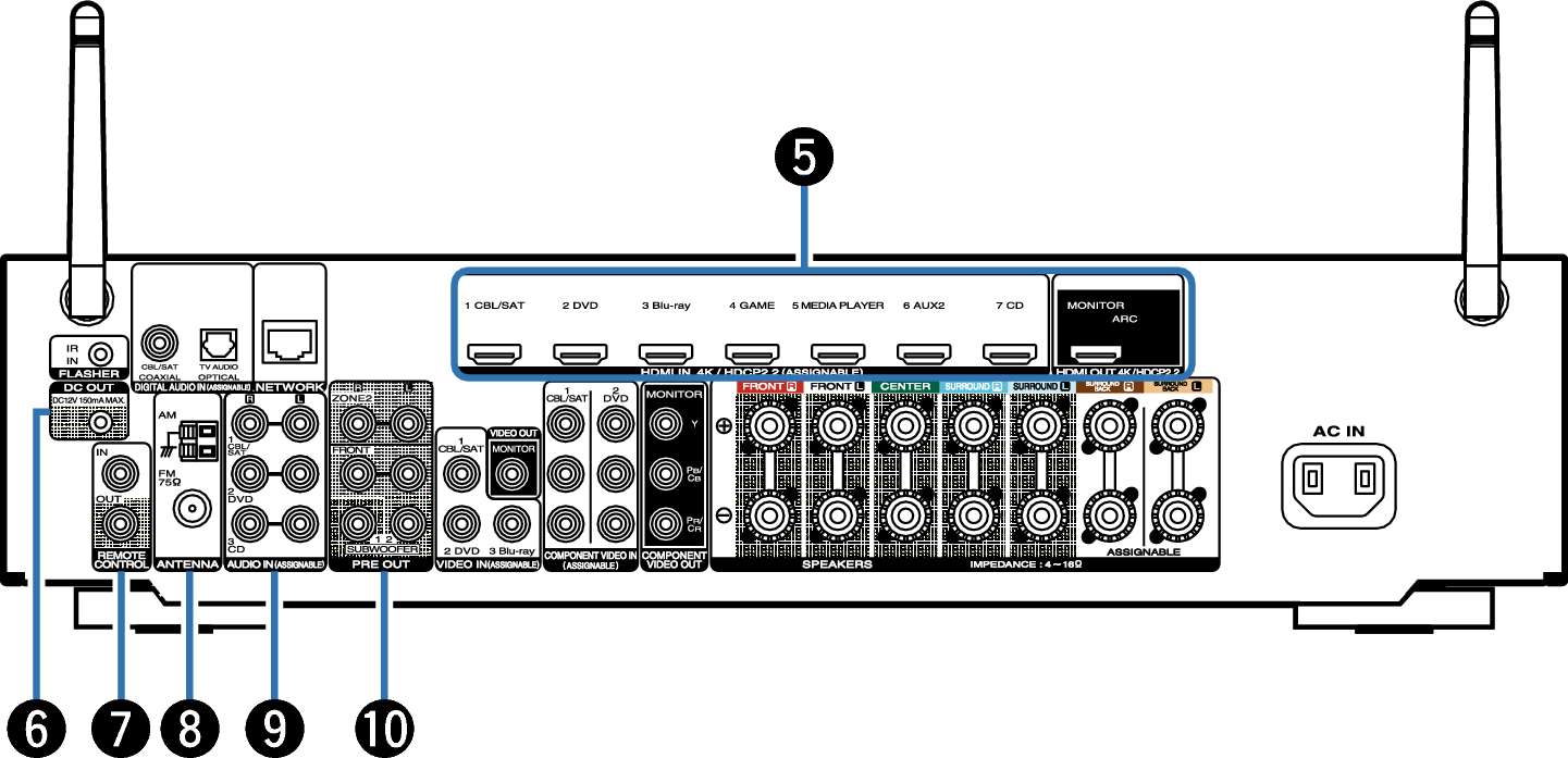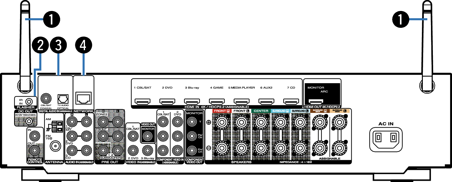 Utilisées pour connecter des récepteurs/transmetteurs infrarouges capables de commander cet appareil et les appareils externes depuis une autre pièce. lien