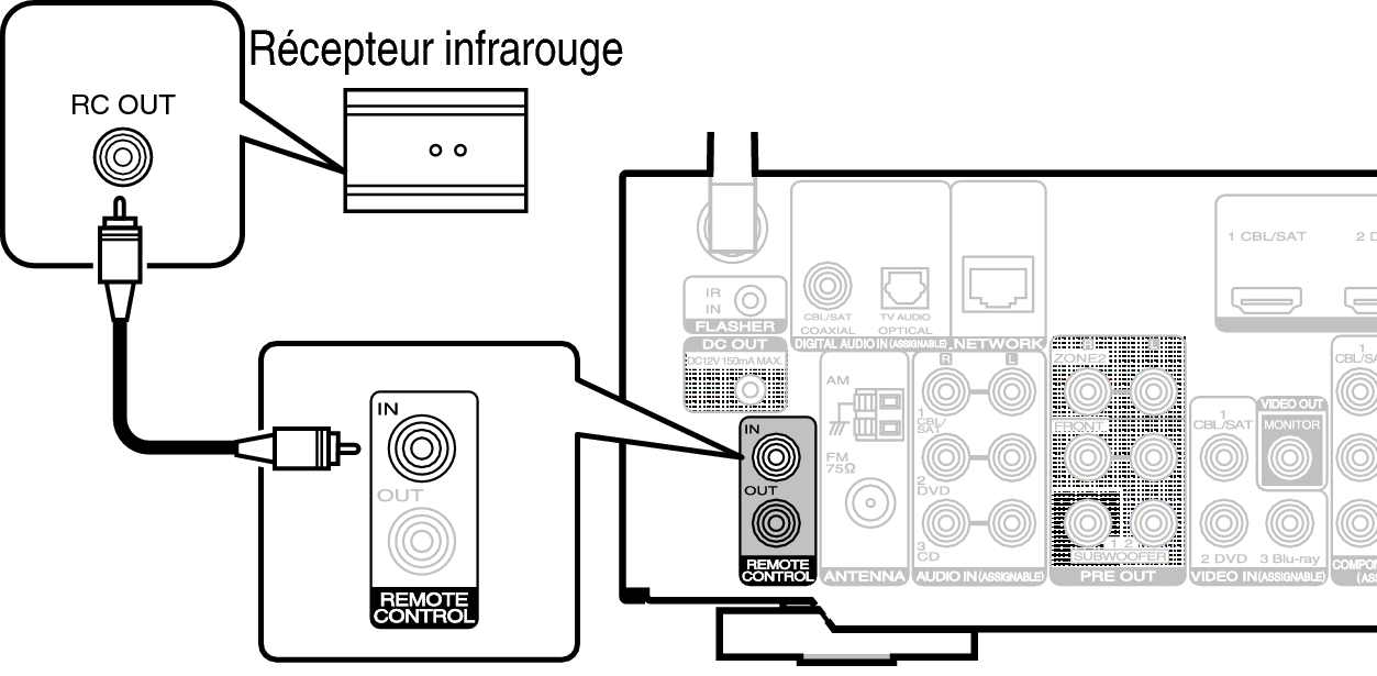 Vous pouvez connecter un récepteur infrarouge externe aux bornes REMOTE CONTROL pour effectuer des opérations sur cet appareil à l’aide de la télécommande fournie sans contact visuel. Ceci peut être nécessaire si l’appareil est caché derrière un placard ou dans un coin, si bien que vous ne pouvez pas pointer directement vers l’appareil avec la télécommande.