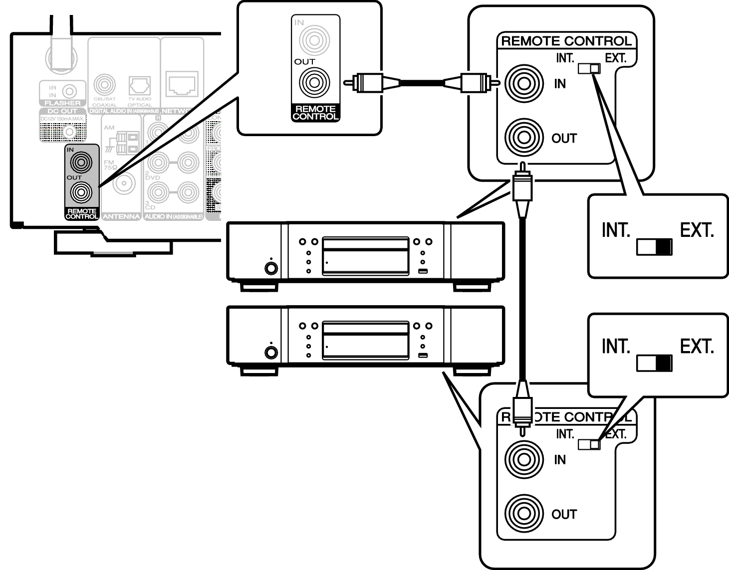 Si vous utilisez un appareil Marantz autre que cet appareil compatible avec la connexion à distance, vous pouvez transmettre des signaux de télécommande en connectant simplement l’appareil à la borne REMOTE CONTROL IN/OUT au moyen d’un câble monaural.
