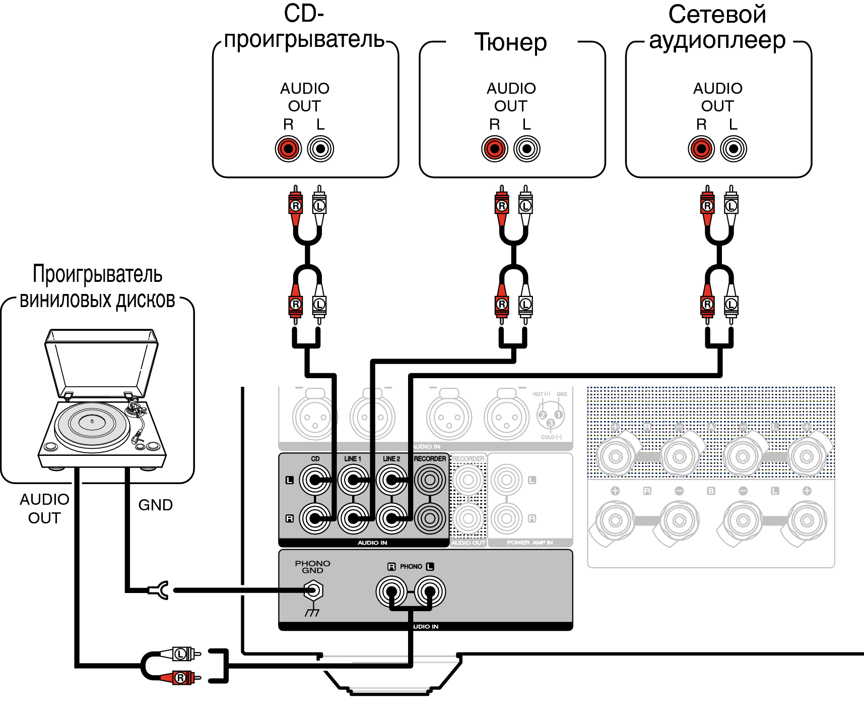 К данному устройству можно подключать проигрыватели виниловых дисков, тюнеры, CD-проигрыватели и сетевые аудиоплееры.